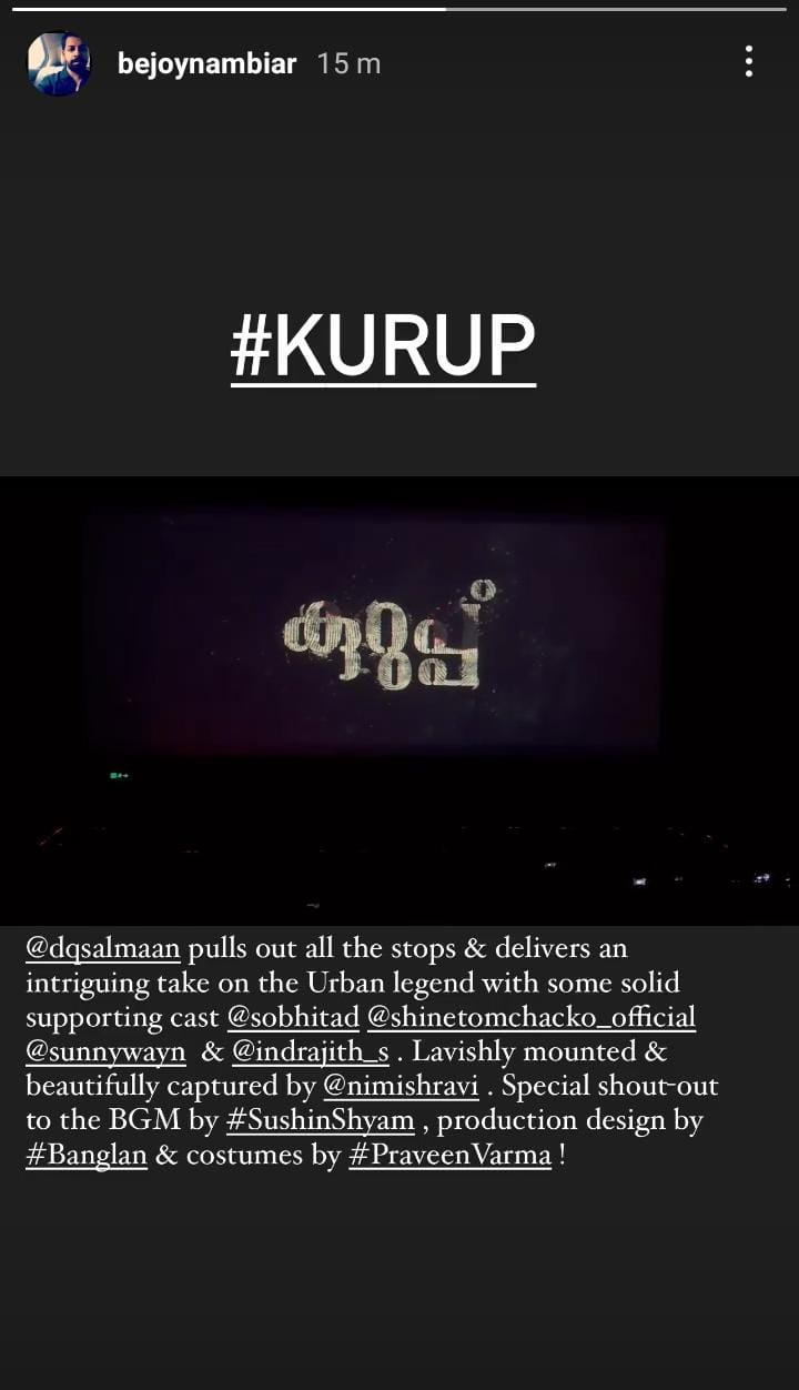 Bejoy Nambiar uploaded a video from the theatre seeing 'Kurup' on Insta. He gushed over Dulquer, saying that the performer "ripped out all the breaks and provides a compelling take on the old myth with maybe some great ensemble players." On Monday, Kurup held a pre-release ceremony in Hyderabad. "Kurup is a meaningful movie for myself and the crew,"