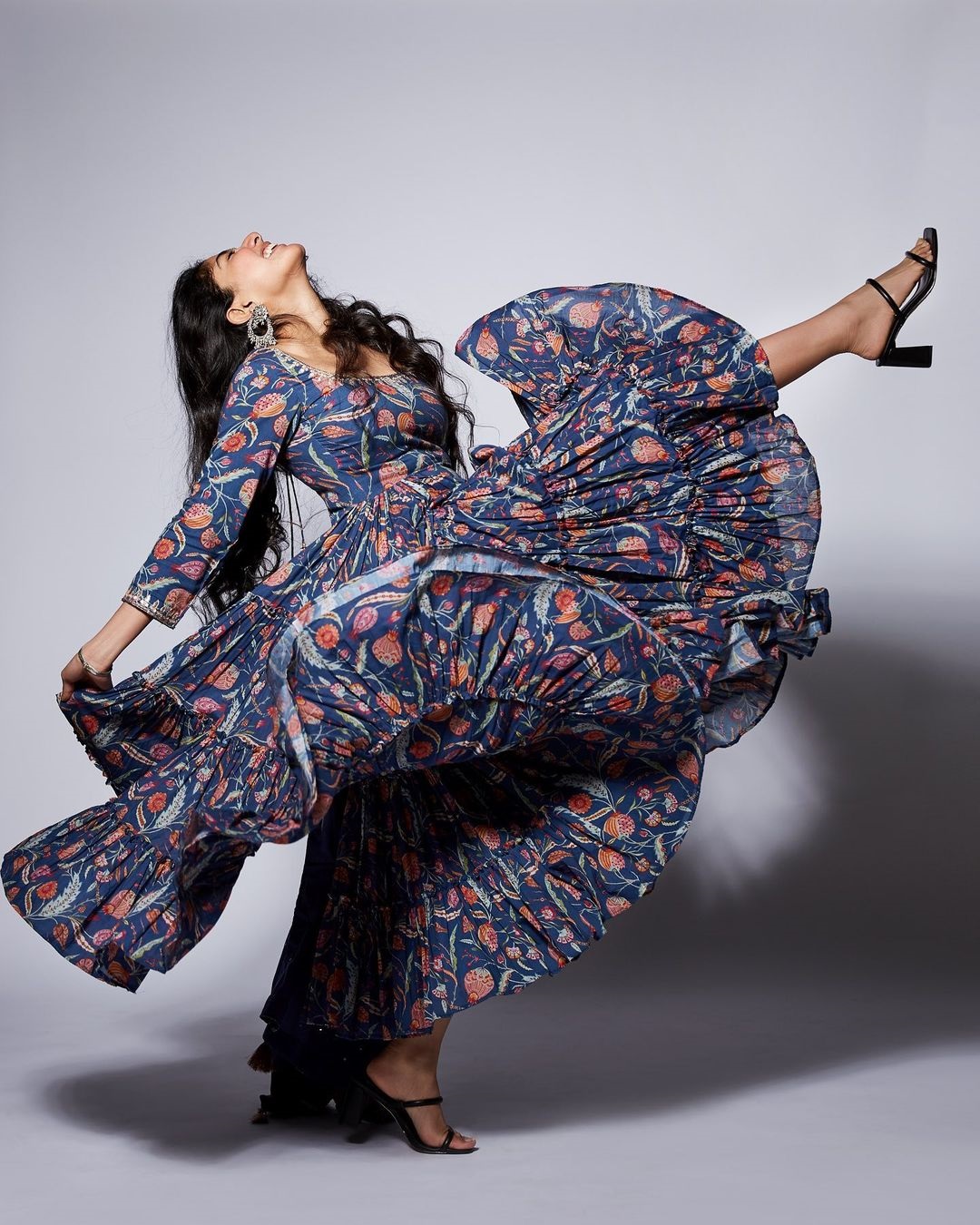 sai pallavi, who starred in the film love Story, has uploaded some stunning photographs on Instagram, and we can't get enough of them. The actress was dressed in a blue gown with a lovely floral design. Her appearance was completed with huge silver jhumkas and minimal makeup. She captioned the photographs as follows: "Let's get down to some boogie woogie."