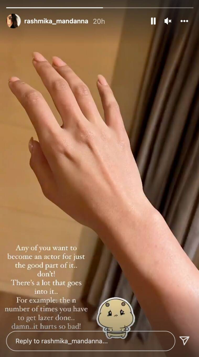 On Thursday, the pushpa actor offered some practical advice to youngsters who want to pursue performing professions. Her goal was to show a peek at the suffering that prominent people go through. "Any of you need to become an actress for simply the great part of it... don't!" she wrote beside a photo of her lasered hand. There's a lot of work involved. For instance, the n times you have to get lazer done.. dang... it hurts so much!"
