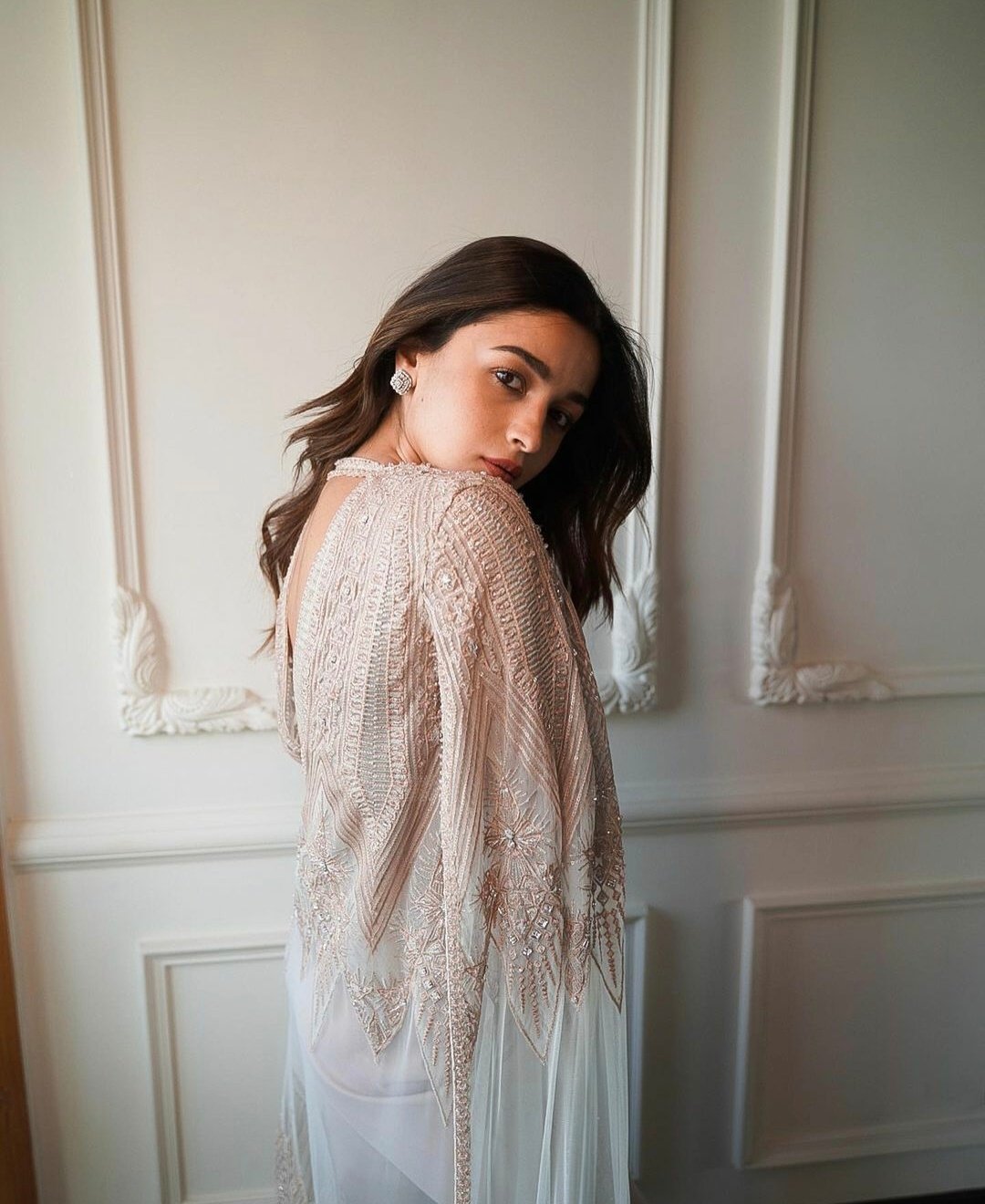 At Meghna Goyal's wedding, alia wore a silver shimmery outfit and with it, she carried silver jewellery. They had kept their open but tied them during the dance.