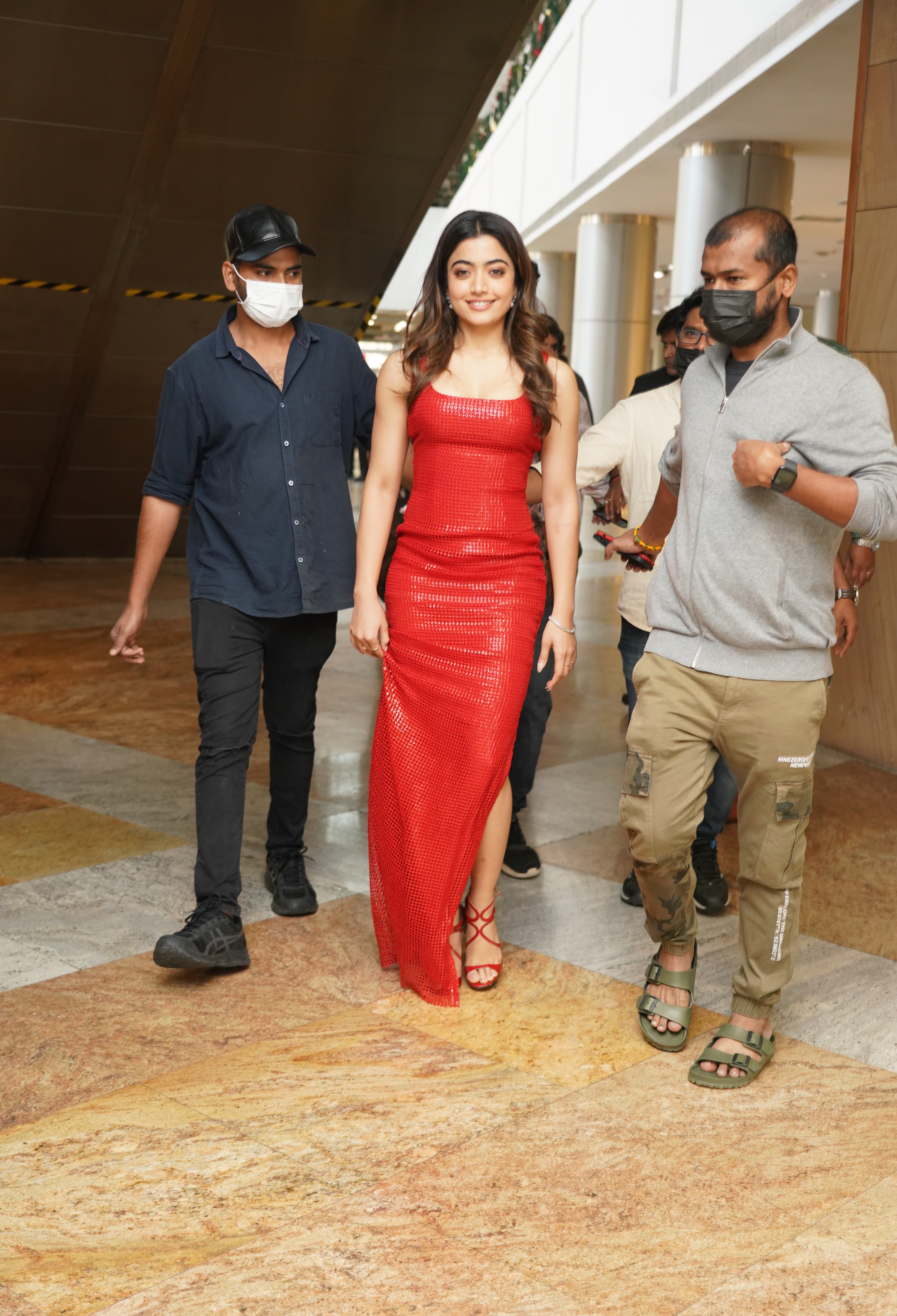 rashmika mandanna is a master stylist who can work with any shade, including yellow and green. The actress from pushpa has walked out in red this occasion, and she looks stunning in it. rashmika mandanna looks very stunning in a lovely crimson gown that would be ideal for a christmas eve date. She completed her look with a pair of bright red shaded heels and a slit cut crimson gown.