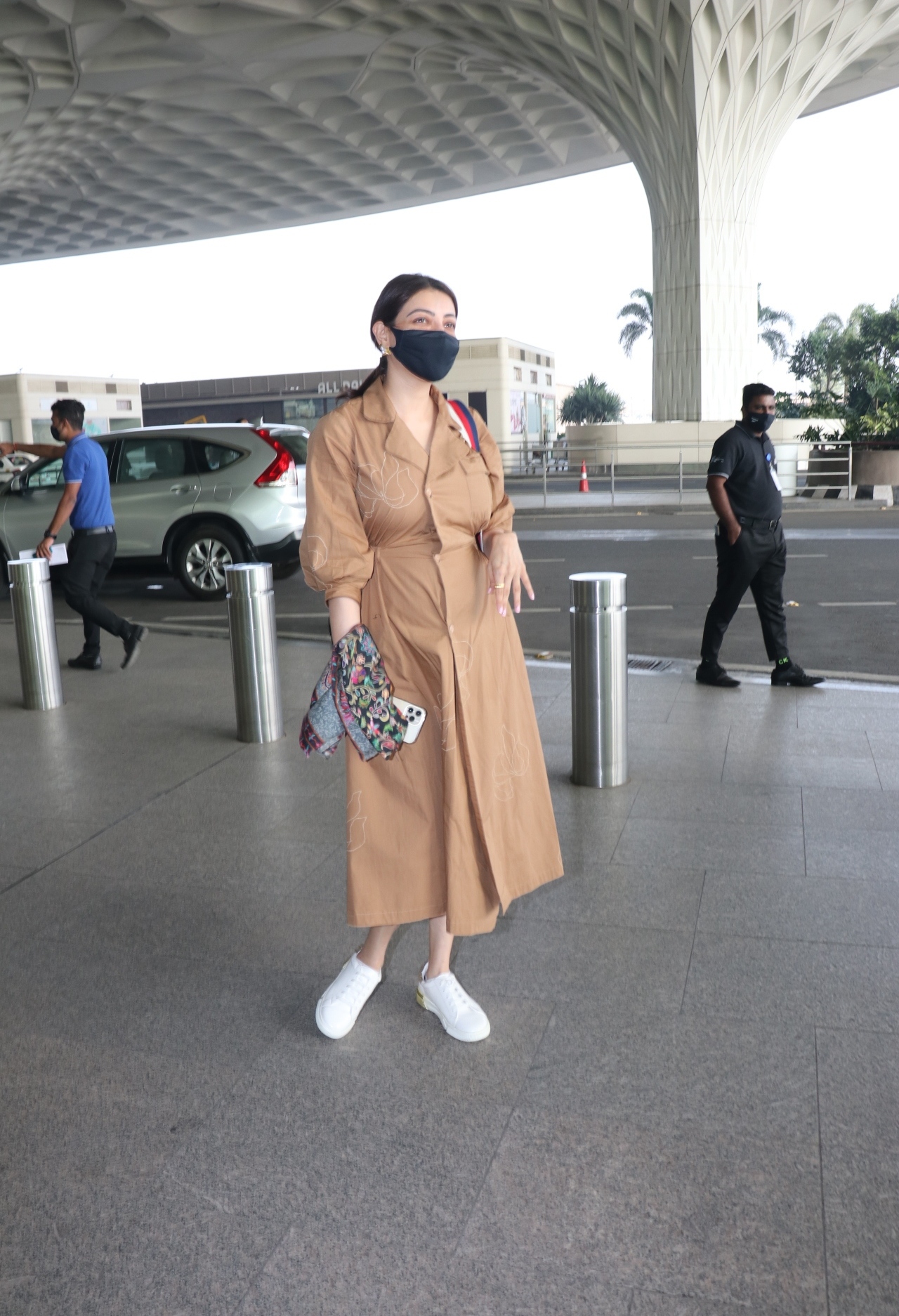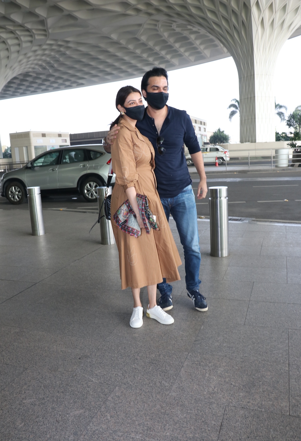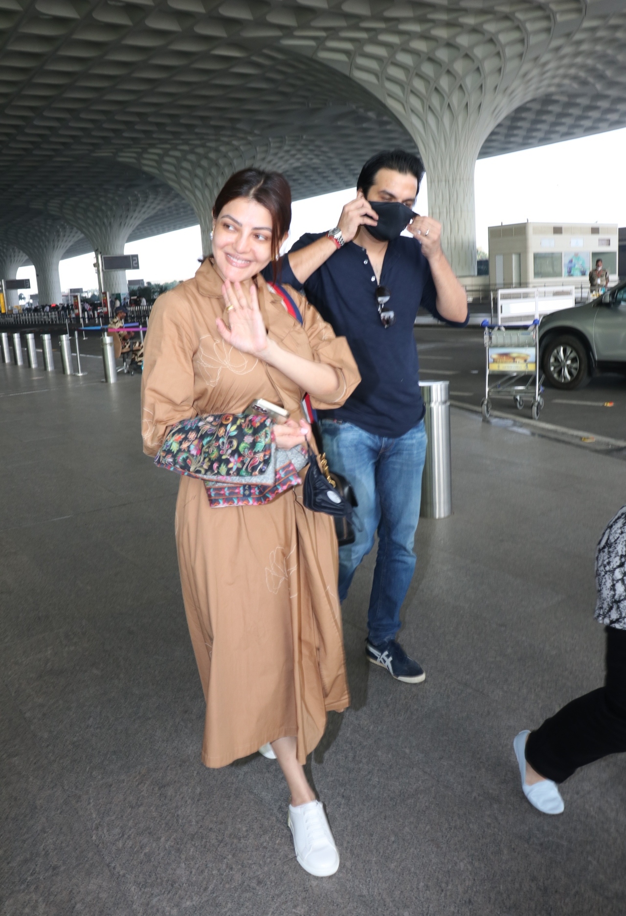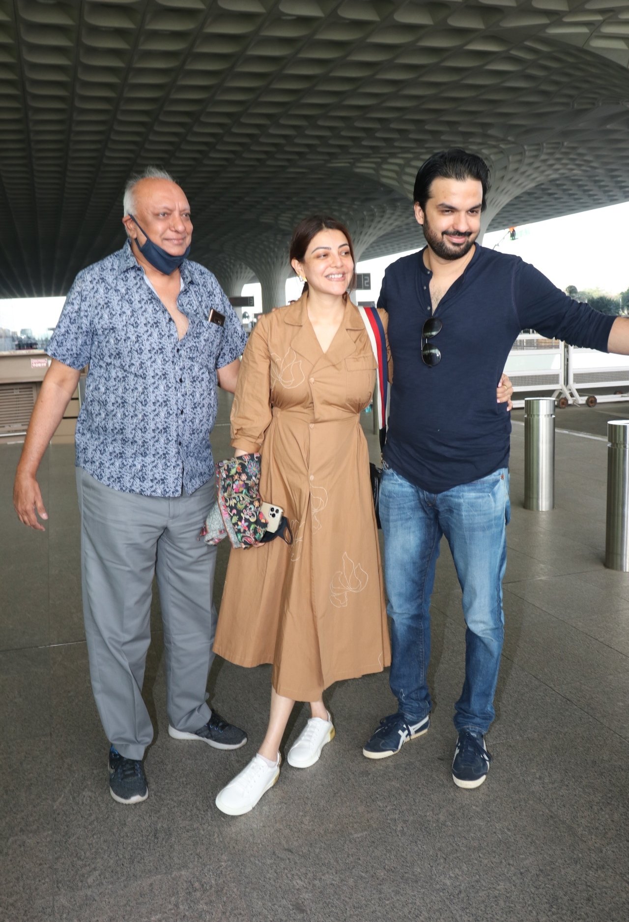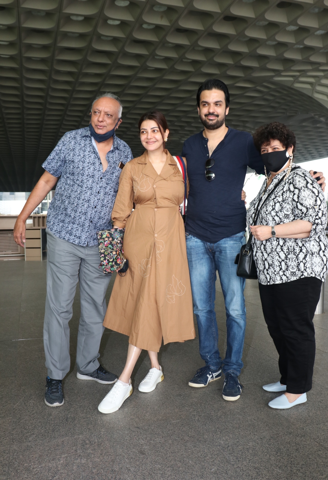 kajal aggarwal was sighted with her husband Gautam Kitchli and her parents at the mumbai airport ahead of the New Year 2022. She and her family smiled brightly as they posed for the cameras. It appears that New Year's Eve 2022 will be spent on a family outing. Previously, actress kajal aggarwal sent a sweet message to her mother-in-law Dheera Kitchlu on her birthday.