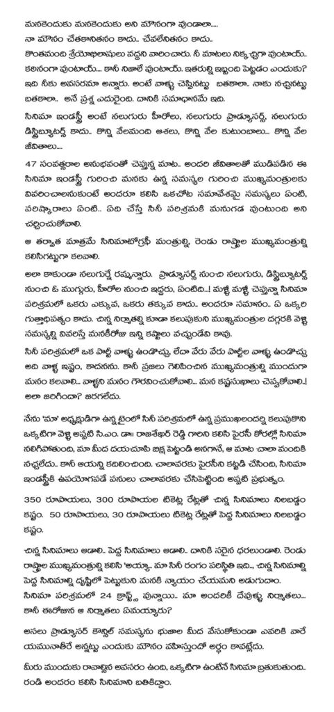 Mohan Babu has written an open letter to producers on the ticket pricing issue that the industry is facing.