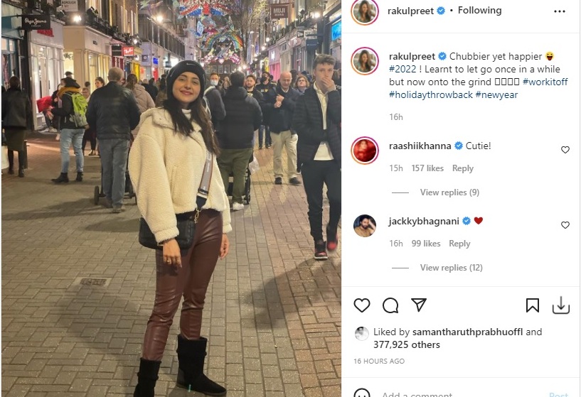 The actress is stunning, and it appears that her beau agrees, as he is all hearts for the photo. With a red heart, Jackky remarked on the photo. rakul captioned the photo, " "#2022 is a chubbier but happy version of #2021! I've learned to let go now and then, but now it's back to work #workitoff #holidaythrowback #newyear." Despite being late to the celebration by releasing a New Year's photo five days later, she has managed to capture everyone's attention.