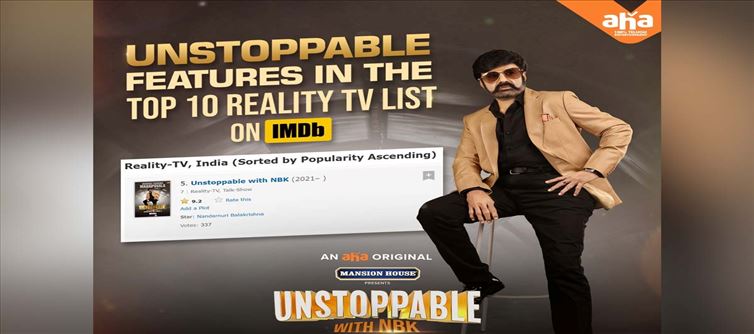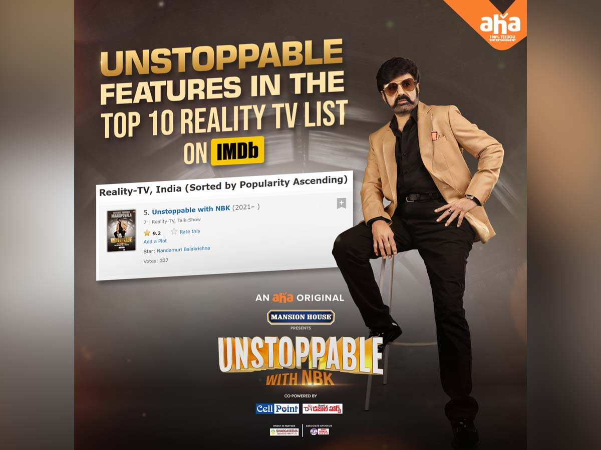 ఇదిలా ఉండగా తాజాగా వెల్లడించిన నివేదిక ప్రకారం బాలకృష్ణ హోస్ట్ గా చేస్తున్న అన్ స్టాపబుల్ షో ఐ.ఎమ్.డి.బి.లో టాప్ టెన్ రియాల్టీ టీవీ జాబితాలలో స్థానం సంపాదించుకోవడం గమనార్హం. అంతేకాదు తాజాగా వెల్లడించిన IMDb జాబితాలో టాప్ టెన్ రియాల్టీ షోలలో ఈ షో ఐదవ స్థానాన్ని కైవసం చేసుకుంది. ఇక షో ప్రారంభమైన అతి కొద్ది రోజులకే ఇంతటి ఘనత సాధించడం తో బాలయ్య అభిమానులు హర్షం వ్యక్తం చేస్తున్నారు.