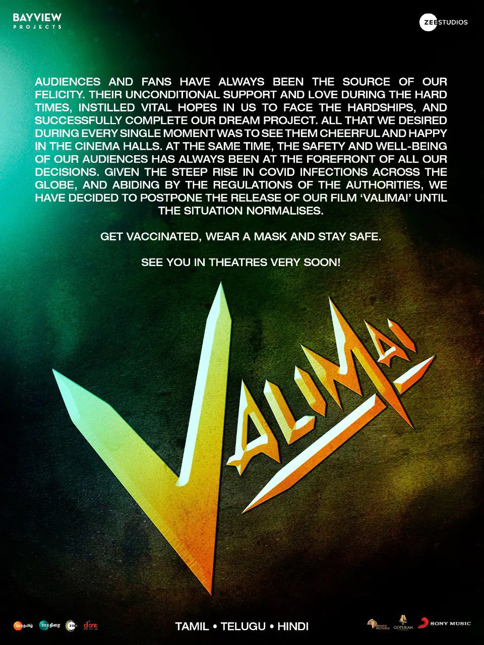 The release of valimai, which was supposed to be a pongal feast, has been postponed. The spread of coronavirus across the country is increasing day by day. States including delhi and tamil Nadu have officially announced the formation of the 3rd wave and announced several restrictions. Similarly, corona regulations are being strictly enforced in Karnataka, Telangana, Andhra Pradesh, and various other states.