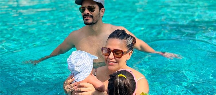 Neha Dhupia has shared two pictures. In one picture, she is seen enjoying the swimming pool with the whole family. Whereas in the second picture, he is holding the son in his lap.
