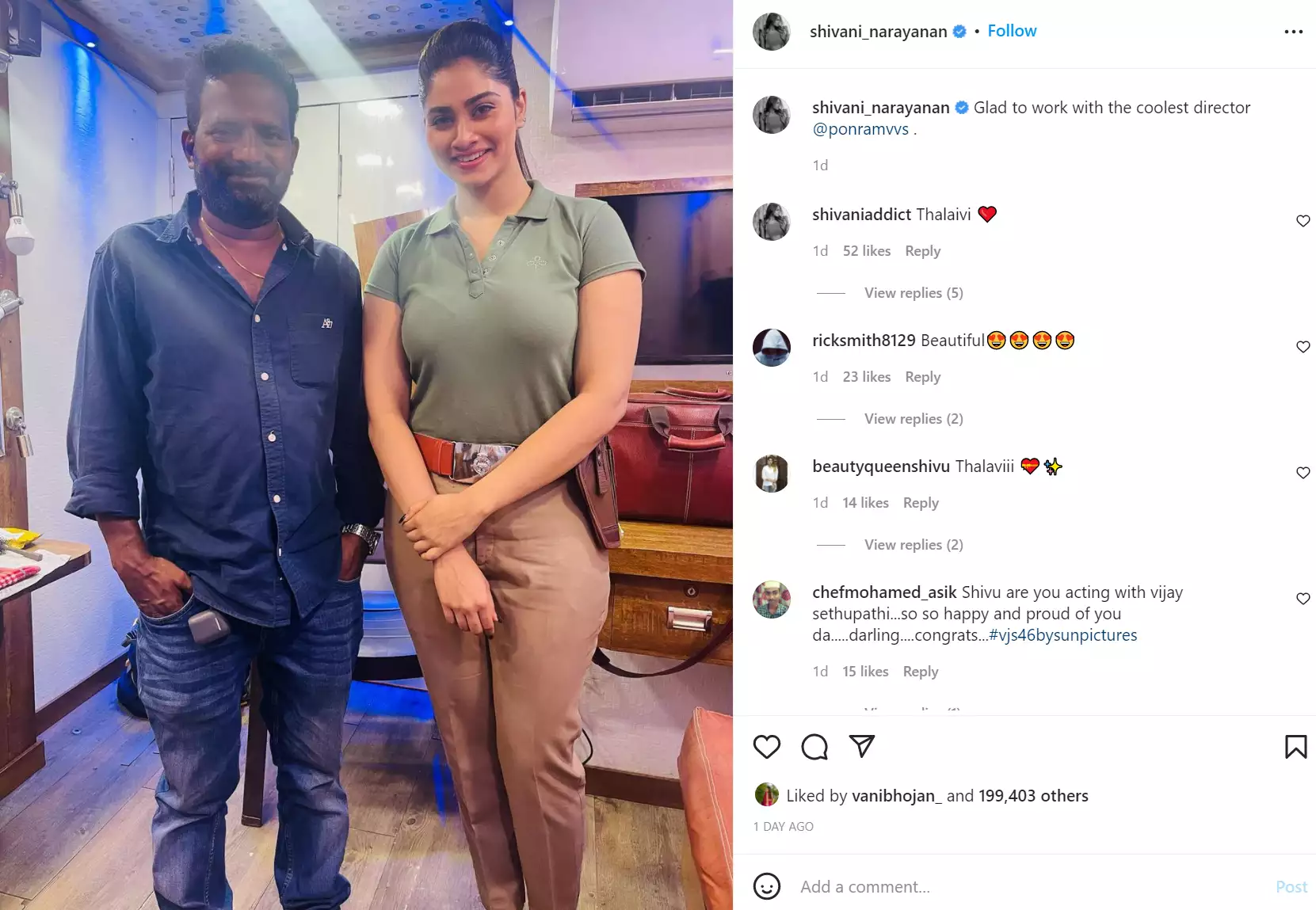 Shivani Narayanan, who is marking her big screen debut in lokesh Kanagaraj's 'Vikram,' will next be collaborating with director Ponram on the project. sun Pictures is producing director Ponram's future feature featuring Vijay Sethupathi, tentatively titled 'VJS 46.' The actress captioned a photo of herself with the filmmaker on her instagram account, saying she is "happy to work with the greatest director."