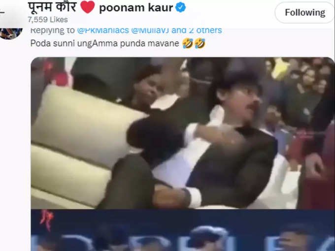 అయితే చాలా వాటిల్లో పవన్ కళ్యాణ్ గురించిన రిఫరెన్స్‌లు కూడా కనిపిస్తుంటాయి. కానీ ఏనాడూ కూడా పూనమ్ కౌర్ ప్రత్యక్షంగా ఆయనపై ట్వీట్లు వేయలేదు. కామెంట్ కూడా చేయలేదు. రెండు బెత్తం దెబ్బలు అంటూ పవన్ కళ్యాణ్ వాడిన మాటలను అలాగే ట్వీట్లలో కూడా మెన్షన్ చేస్తుంటుంది. గురూజీ అంటూ కౌంటర్లు కూడా వేస్తుంటుంది. ఇక పూనమ్ కౌర్ తన సోషల్ మీడియా ఖాతాలో లైక్ చేసే వీడియోలు కూడా అందరినీ బాగా ఆశ్చర్యపరుస్తుంటాయి.