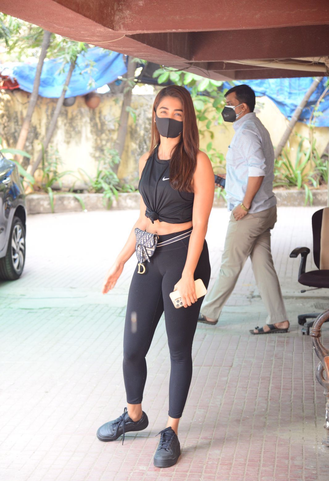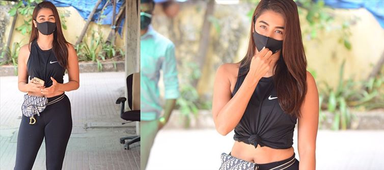 pooja hegde was photographed in the fitness centre after a training in Mumbai. She went to the gym in an extremely sophisticated and beautiful outfit. The actress was clothed in a black sleeveless with black leggings. She showed off her toned abs by tying her top in a knot and her navel is visible. pooja finished the combination with a black sneaker and a Dior purse around her midsection. She can be seen with her tresses open and following the COVID 19 guidelines.