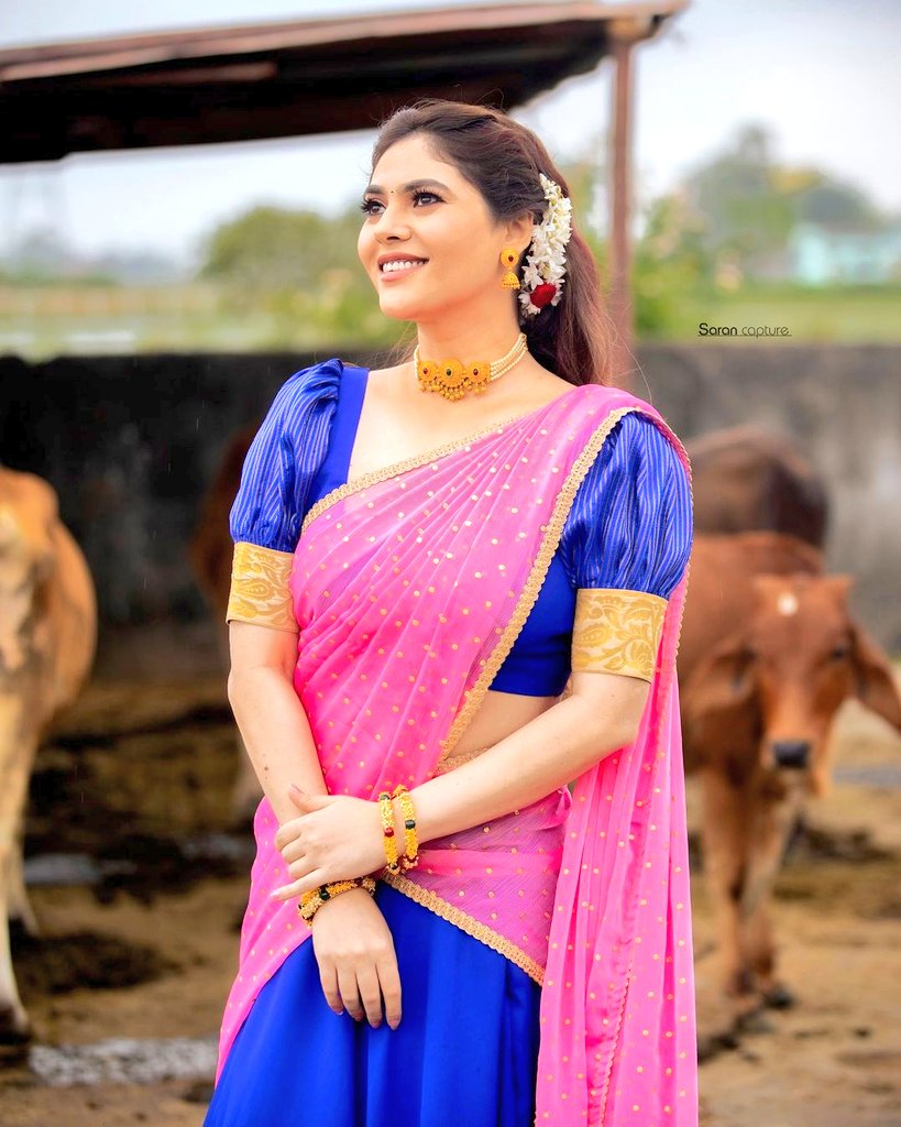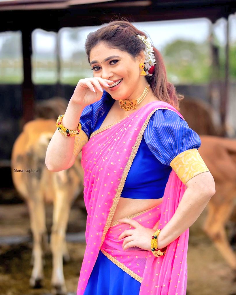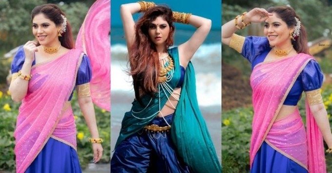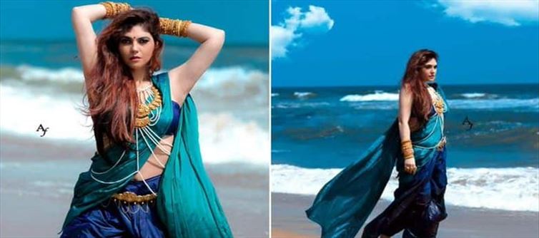 In that sense, the photoshoot given by actress Sherin, who is currently dressed as Bhagwati Devasena and leaning on the rocks on the beach, is eye-catching.