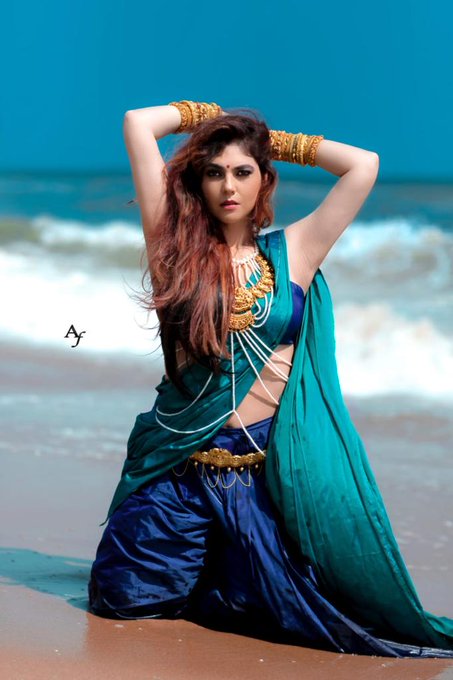 The photoshoot of actress sherin dressed as Bhagwati Devasena leaning against the rocks on the beach is eye-catching.