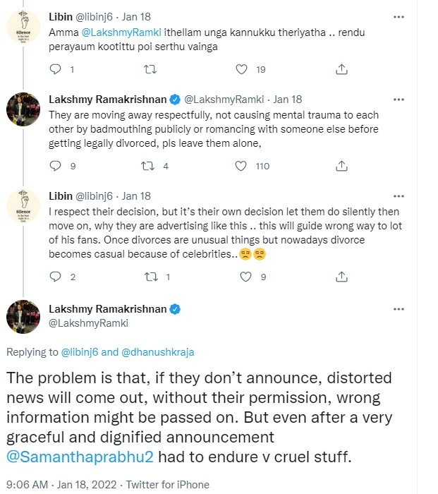 "I appreciate their choice, but it's their conscious choice, let them do discreetly then go on," the person continued, tagging Lakshmy. "Why are they promoting like this... this will steer a lot of his admirers in the opposite direction." Divorces were once uncommon, but owing to celebrities, they are now commonplace." "The issue is that if they don't proclaim, blurry news will come out, and without their approval, inaccurate info will be passed on," movie director Lakshmy said, referring to samantha Ruth Prabhu, who had previously faced unpleasant rumours following her divorce from husband Naga Chaitanya. But, despite a very polite and respectful pronouncement, @Samanthaprabhu2 had to go through a lot of pain."