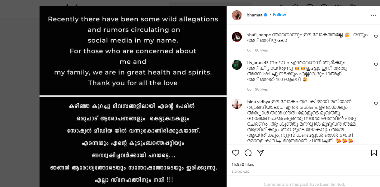కొంతమంది నటీమణులు.. ఎంతో బాగా స్టార్ పొజిషన్ లో ఉన్నప్పుడు.. ప్రతి ఒక్కరు గుర్తుపెట్టుకుంటారు. కానీ కాస్త స్టార్ డమ్ తగ్గిన వెంటనే.. వారిని మర్చిపోతూ ఉంటారు. అలా అడపదడప సినిమాలలో నటిస్తూ ఉండే నటులు కొన్ని సంవత్సరాలుగా కనిపించకుండా ఉంటే.. ఇక వారి నుంచి ఊహించని విధంగా కొన్ని వార్తలు వస్తూ ఉంటాయి. అలా ఇబ్బంది పడిన ఒక నటి గురించి మనం తెలుసుకుందాం.తాజాగా కొద్ది రోజుల క్రితం మలయాళం నటి భామ ఒకరు ఆత్మహత్య చేసుకుంది అన్నట్లుగా సోషల్ మీడియాలో బాగా వార్తలు బయటకు వచ్చాయి.. ఏమైందా అని అందరూ ఆరా తీసే లోపు.. అలా నేను ఆత్మహత్య చేసుకోలేదు.. అంటూ ఆ నటి షాక్ ఇచ్చింది. దీంతో ఇప్పుడు ఆమె చెప్పిన ఈ మాటలు తెగ వైరల్ గా అవుతున్నాయి..అసలు విషయంలోకి వెళితే 2017వ సంవత్సరంలో వేధింపుల కేసులో తిరిగి విచారిస్తున్నారు అని భయంతో ఈ ముద్దుగుమ్మ ఆత్మహత్యకు పాల్పడింది అంటూ సోషల్ మీడియాలో కొద్దిరోజులుగా చక్కర్లు కొడుతూనే ఉన్నాయి. తాజాగా ఇలాంటి విషయంపై ఈ భామ స్పందించి.. నాపై వస్తున్న ఈ పుకార్లులలో ఎలాంటి వాస్తవం లేదు అని తెలియజేసింది. నా గురించి ఎవరు భయపడవద్దు.. నేను చాలా ఆరోగ్యంగా ఉన్నాను.. మీరు చూపిస్తున్న ఈ ప్రేమ అభిమానాలకు ధన్యవాదాలు అని తెలియజేసింది ఈ ముద్దుగుమ్మ.దీంతో ఈ ఆత్మహత్య వార్త కాస్త కనుమరుగైంది అని చెప్పవచ్చు. తొలిసారిగా నైవేద్యం అనే సినిమాతో ఇండస్ట్రీలోకి అడుగుపెట్టింది భామ. ఆ తరువాత ఎన్నో సినిమాలలో కూడా నటించింది.. 2020 వ సంవత్సరంలో దుబాయ్ కు చెందిన ఒక వ్యాపారవేత్త అరుణ్ ను వివాహం చేసుకుంది. దీంతో సినిమాలకు దూరమైంది. ఇక గత సంవత్సరం ఒక పండంటి బిడ్డకు జన్మనిచ్చింది ఈ ముద్దుగుమ్మ .. సోషల్ మీడియాలో వచ్చే కథనాల వల్ల చాలా ఇబ్బందులు ఎదుర్కొన్నాను.. ఏది నిజమో ఏది అబద్ధమో తెలుసుకొని రాయండి అంటూ తెలియజేసింది.