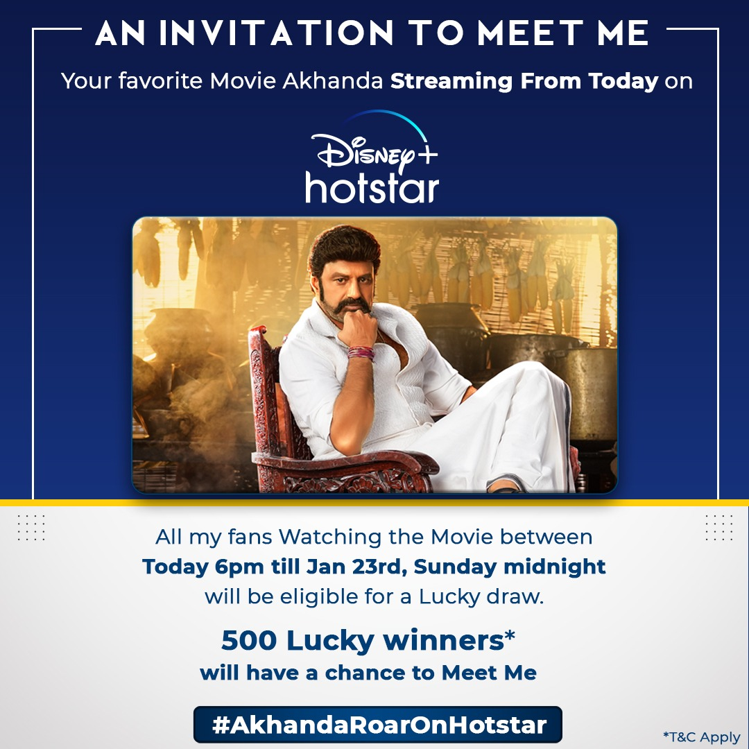 పక్కా మాస్ యాక్షన్ తో కూడిన ఎమోషనల్ ఎంటర్టైనర్ గా దర్శకుడు బోయపాటి ఈ సినిమాని తెరకెక్కించారు. అలానే ఈ సినిమాకి థమన్ అందించిన సాంగ్స్, బీజీఎమ్ అందరినీ ఎంతో ఆకట్టుకన్నాయి. రిలీజ్ అయిన అన్ని ఏరియాల్లో మంచి కలెక్షన్స్ సొంతం చేసుకున్న ఈ సినిమా సక్సెస్ఫుల్ గా 50 రోజులు పూర్తి చేసుకోవడంతో ఆ వేడుకల్ని నిన్న హైదరాబాద్ లోని సుదర్శన్ థియేటర్ లో నిర్వహించింది యూనిట్. అయితే విషయం ఏమిటంటే అఖండ మూవీ నేటి సాయంత్రం నుండి ప్రముఖ ఒటిటి మాధ్యమం డిస్నీ హాట్ స్టార్ లో ప్రసారంకానుంది. కాగా నేడు జనవరి 21 సాయంత్రం 6 గంటల నుండి ఆదివారం అనగా జనవరి 23 అర్ధరాత్రి వరకు సినిమాని వీక్షించిన వారిలో 500 మంది లక్కీ విన్నర్స్ ని ఎంపిక చేసి వారిని స్వయంగా బాలయ్యతో కలిసే అవకాశం కల్పిస్తున్నారు డిస్నీ హాట్ స్టార్ వారు. నేడు కొద్దిసేపటి కృతం ఈ ప్రకటన రావడంతో ఎప్పుడెప్పుడు సినిమాని చూద్దామా అని బాలయ్య ఫ్యాన్స్ తో పాటు ప్రేక్షకాభిమానులు ఎంతో ఆతృతగా ఎదురు చూస్తున్నారు. మరి ఇంకెందుకు ఆలస్యం, మీరు కూడా అఖండ మూవీ చూసేయండి బాలయ్యని కలిసే అదృష్టాన్ని పరీక్షించుకోండి.