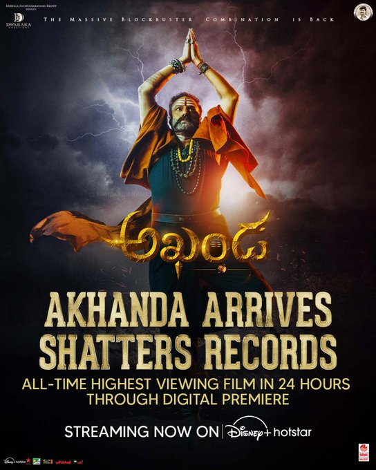 ముఖ్యంగా మంచి మాస్ యాక్షన్ తో కూడిన కమర్షియల్ ఎంటర్టైనర్ గా దర్శకుడు బోయపాటి ఈ సినిమా ద్వారా హిట్ కొట్టి మళ్ళి ఫామ్ లోకి వచ్చారు. ఇక మరోవైపు ఎప్పటి నుండి మంచి సక్సెస్ కోసం ఎదురు చూస్తున్న బాలయ్యకి కూడా అఖండ సక్సెస్ మంచి ఊపును అందించింది. ద్వారకా క్రియేషన్స్ బ్యానర్ పై మిరియాల రవీందర్ రెడ్డి ఈ సినిమాని ఎంతో భారీ వ్యయంతో నిర్మించారు. పూర్ణ, శ్రీకాంత్, కాలకేయ ప్రభాకర్, జగపతి బాబు, సుబ్బరాజు తదితరులు ఇతర పాత్రలు చేసిన ఈ సినిమా రెండు రోజుల క్రితం సక్సెస్ఫుల్ గా 50 పూర్తి చేసుకోగా ఆ సందర్భంగా వేడుకల్ని హైదరాబాద్ లోని ప్రముఖ థియేటర్ అయిన సుదర్శన్ లో ఘనంగా నిర్వహించారు యూనిట్ సభ్యులు. ఇక అసలు మ్యాటర్ లోకి వెళితే, అఖండ సినిమాని మొన్న సాయంత్రం ప్రముఖ ఓటిటి మాధ్యమం డిస్నీ హాట్ స్టార్ ద్వారా ఓటిటి ప్రేక్షకుల ముందుకు తీసుకువచ్చారు. కాగా ఈ సినిమా గడచిన 24 గంటల్లో అత్యధికులు వీక్షించిన సినిమాగా ఒక గొప్ప రికార్డు ని సొంతం చేసుకుందని కొద్దిసేపటి క్రితం పలువురు సినీ విశ్లేషకులు వెల్లడిస్తున్నారు. ఇప్పటివరకు మరే తెలుగు సినిమాకి రానన్ని వ్యూస్ అఖండ దక్కించుకుందని, చూడబోతే ఈ సినిమా రాబోయే రోజుల్లో మరింత అద్భుతంగా వ్యూస్ ని రాబట్టే అవకాశం కనబడుతోందని వారు అంటున్నారు. మొత్తంగా అటు థియేటర్స్ లోనే కాక ఇటు ఓటిటి లో కూడా తన హవా చూపిస్తూ అఖండ దూసుకెళ్తుండడం విశేషం.