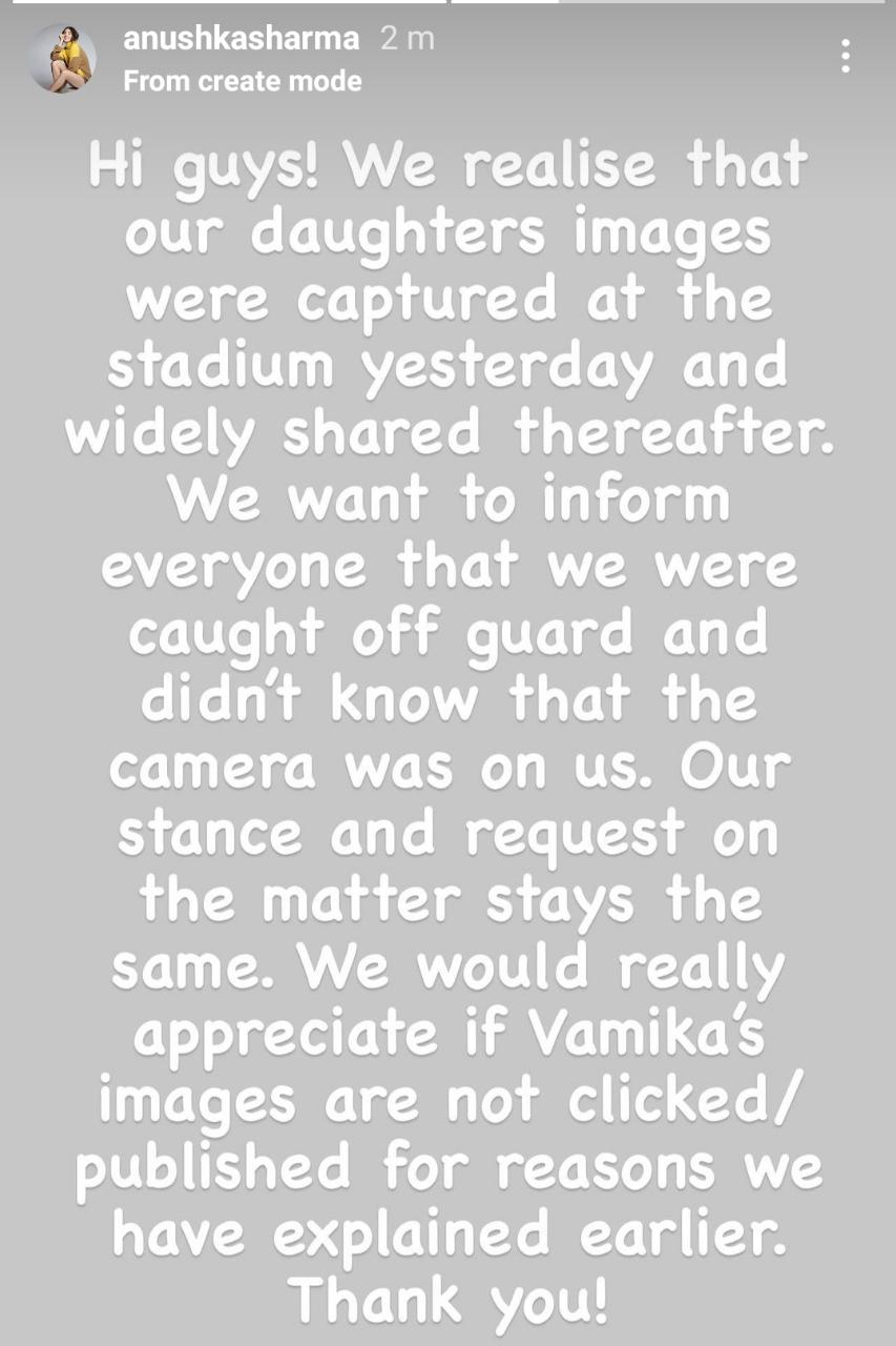 Since Vamika's birth in january 2021, anushka and Virat have kept her identity a well guarded secret. As soon as the photographs became viral, the starlet put out a statement. It says: "Hello there, everyone! We are aware that our daughter's photos were taken at the arena on sunday and widely publicized afterwards. We'd like to let everyone know that we were taken off guard and had no idea the camera was trained on us.