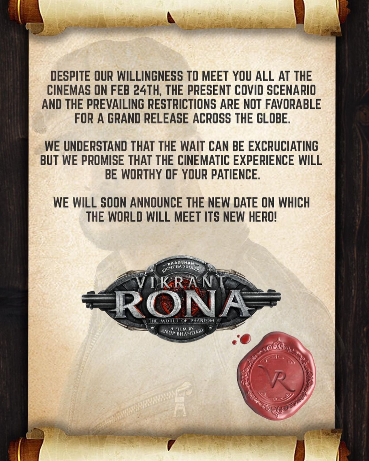 Vikrant Rona, the magnum opus of kannada star Kichcha sudeep, has been delayed after rrr and Radhe Shyam! In a public announcement, the movie's producers claimed, "We will immediately introduce the new date." Vikrant Rona's producers have also stated that the cinematic experience will be worth the wait.
