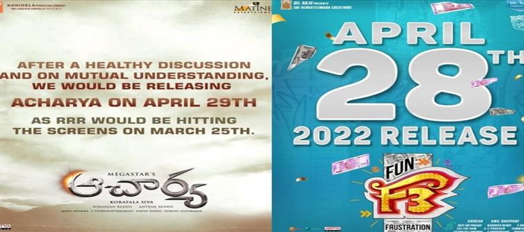 ముఖ్యంగా కరోనా పరిస్థితులు వచ్చే నెలలో చాలా వరకు తగ్గితే ఫిబ్రవరి 25 విడుదల కానున్నట్టు తెలుస్తున్నది. లేనయెడల ఏప్రిల్01 వరకు మాత్రం ఆగాల్సిందే అని తెలుస్తోంది. ఈ సినిమాను సూర్యదేవర నాగవంశీ, సితారా ఎంటర్టైన్ మెట్స్ బ్యానర్పై నిర్మిస్తున్నారు. ముఖ్యంగా ‘ఆచార్య‘ ‘ఎఫ్ 3’ లాంటి సినిమాలు కూడా వాయిదా పడిన సంగతి తెలిసినదే. తాజాగా రెండు సినిమాలు కొత్త విడుదల తేదీలను ప్రకటించాయి. రెండు సినిమాల్లో ఒక్కరోజు గ్యాప్లో థియేటర్లలో పోటీ పడనున్నాయి. ఏప్రిల్ 28న ఎఫ్-3 అడుగుపెడుతుండగా..ఏప్రిల్ 29న ఆచార్య రానున్నట్టు మేకర్స్ ప్రకటించారు. అన్ని ఆలోచించుకుని అందరి సూచలను తీసుకొని ఆచార్యను ఏప్రిల్ 29న విడుదల చేయనున్నట్టు ప్రకటించారు మూవీ మేకర్స్. అదేవిధంగా ఆర్ఆర్ఆర్, మార్చి 25న థియేటర్లలో విడుదల కానున్నదని కూడా తెలిపారు. దీంతో ఆతేదీని రాజమౌళికి ఇచ్చినట్టు మేకర్స్ వెల్లడించారు. మరొక వైపు మార్చి 11న రాధేశ్యామ్ విడుదలవుతుందని టాక్ వినిపిస్తోంది. ఇకపోతే ఎఫ్-3 రెండు డిఫరెంట్ కథనాలు, ఒకటి నవ్వులు పూయిస్తే.. మరొకటి ఆలోచింపజేస్తుంది. మరీ ఈ రెండు సినిమాలలో ఏదీ భారీ హిట్గా నిలుస్తుందో చూడాలి మరీ.