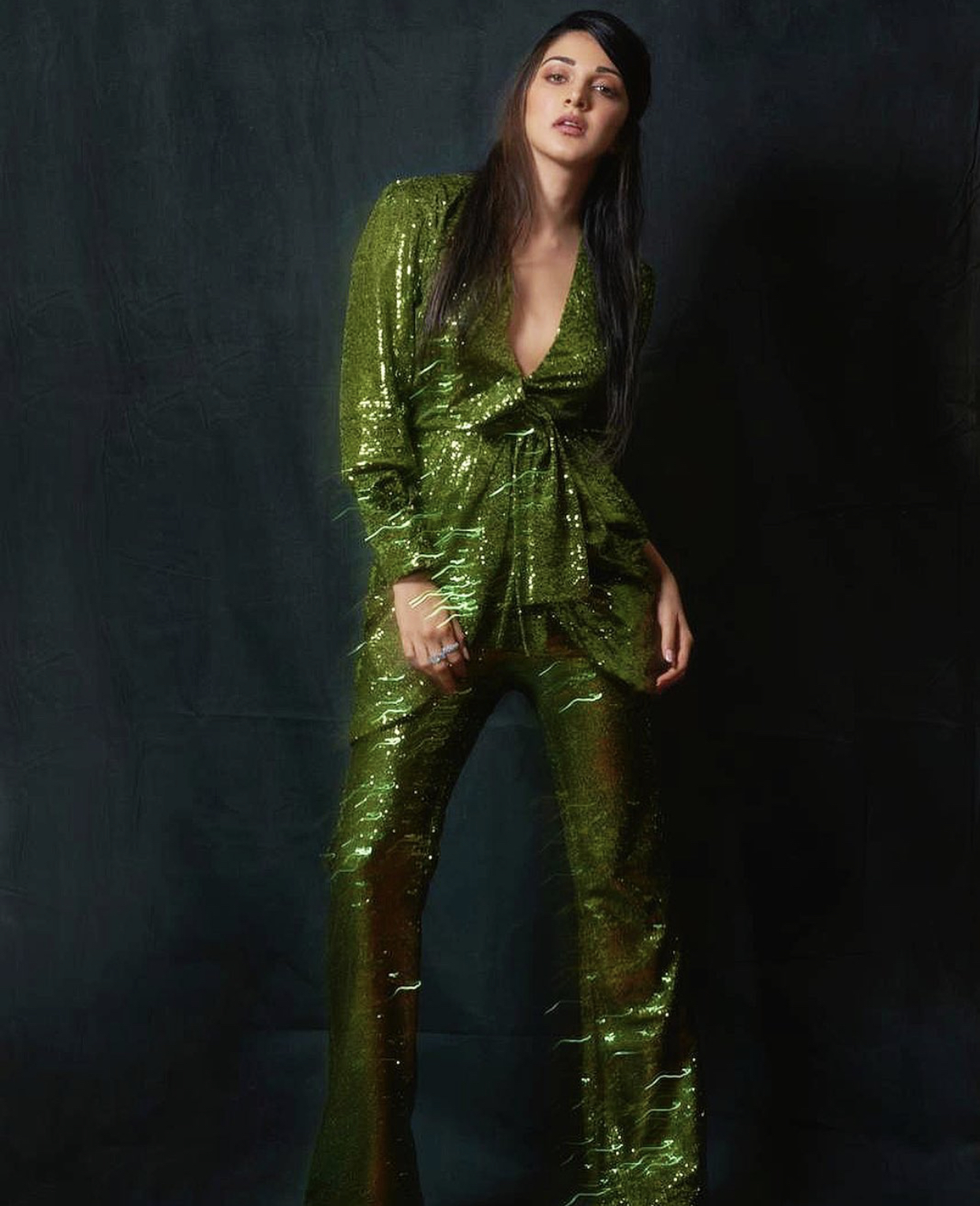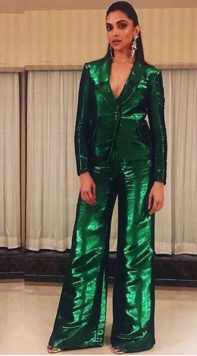 Deepika Padukone sparkled like a christmas tree in Monisha Jaising's beautiful emerald green gown. deepika increased the hotness quotients by going without a shirt beneath her blazer in her party-ready piece, which had a metallic edge to it. YSL's statement earrings completed her dazzling ensemble. The diva opted for strong, smoky eyes and muted lips for her makeup. Her hair was yanked half-up with a pompadour on top to add volume to her tresses.