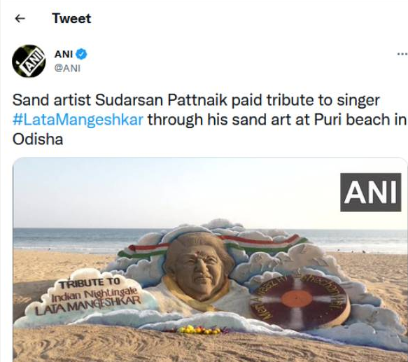 He also posted on his twitter page with a photo of the sand sculpture that he was paying homage to India's Nightingale with his sand sculpture. That sand sculpture that is so beautifully designed has captivated everyone.