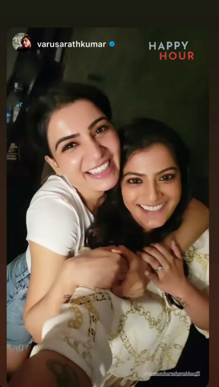 The Naandhi actress uploaded a photo with samantha, in which they can be seen smiling brightly. Varalaxmi and samantha are also twins in white, with the latter wearing a floral dress. samantha is currently awaiting the release of the legendary film Shaakuntalam on the work front. She'll also be seen in Kaathu Vaakula Rendu Kadhal, a sentimental tamil drama. Varalaxmi Sarathkumar, on the other hand, has been cast alongside gopichand malineni in Balakrishna's forthcoming #NBK107.