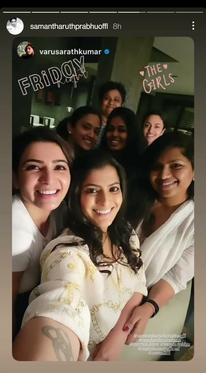 Samantha had a fun friday night with her girlfriends Varalaxmi Sarathkumar, Neeraja Kona, and many others. samantha made a statement on how to master a basic look in perfection once again as the female group partied the saturday night away. For friday night, the actress wore shorts and a white t-shirt, which we just adore. samantha and Varalaxmi are also the new BFFs in town, as evidenced by the fact that they spent their final weekend together.