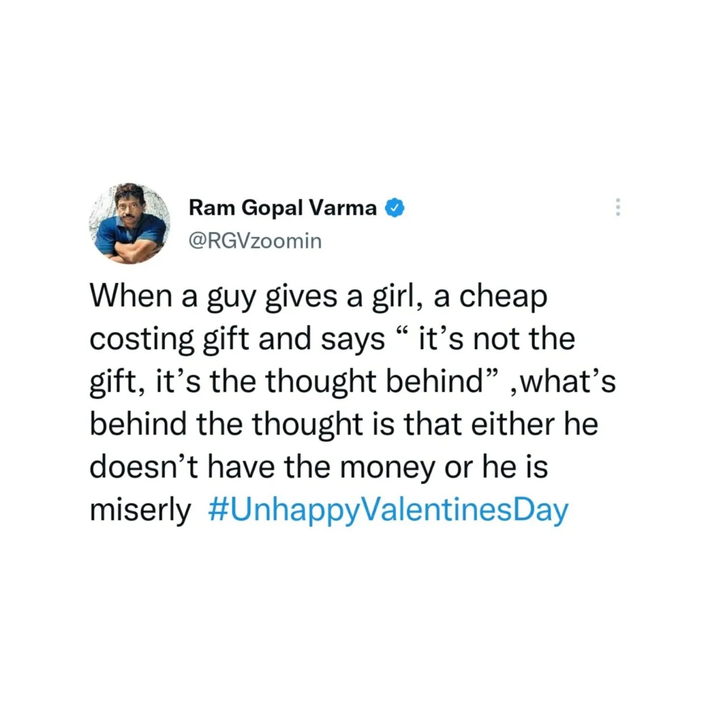 "I am not intending to tell Happy Valentine's Day because valentine does a poor job of keeping lovers united," one of the posts read. The number of breakups demonstrates this." "My suggestion to any lovers preparing to break up is to wait until tonite to get ur valentine present," he continued. The ideal thing for lovers is free...but the presents that must be provided before that are expensive," he wrote in another article. These aren't the only posts about Valentine's Day that ram Gopal Verma has written.