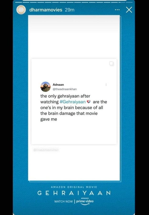 Netizens were taken aback when dharma Productions' official instagram account released a scathing review of their movie 'Gehraiyaan' on their instagram post on Sunday. The message was pulled down once it attracted notice, but many users had already screenshotted the error and shared it on social networking sites. "The only Gehraiyaan after viewing Gehraiyaan are the kind in my brain due to all the head trauma that movie gave me," the review said.