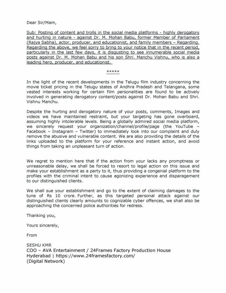 "We will sue your enterprises and go to the point of collecting damages of Rs 10 crore," the letter continued. In response to the vicious trolls, mohan babu stated a few days ago that he believes there is a conspiracy at work. "I'm perfectly aware that this trolling group is led by two heroes. They've paid trolls to harass vishnu and Lakshmi. "Karma will come back to haunt them someday," he predicted. mohan babu appreciates memes, according to him. He did say, though, that they should be decent.