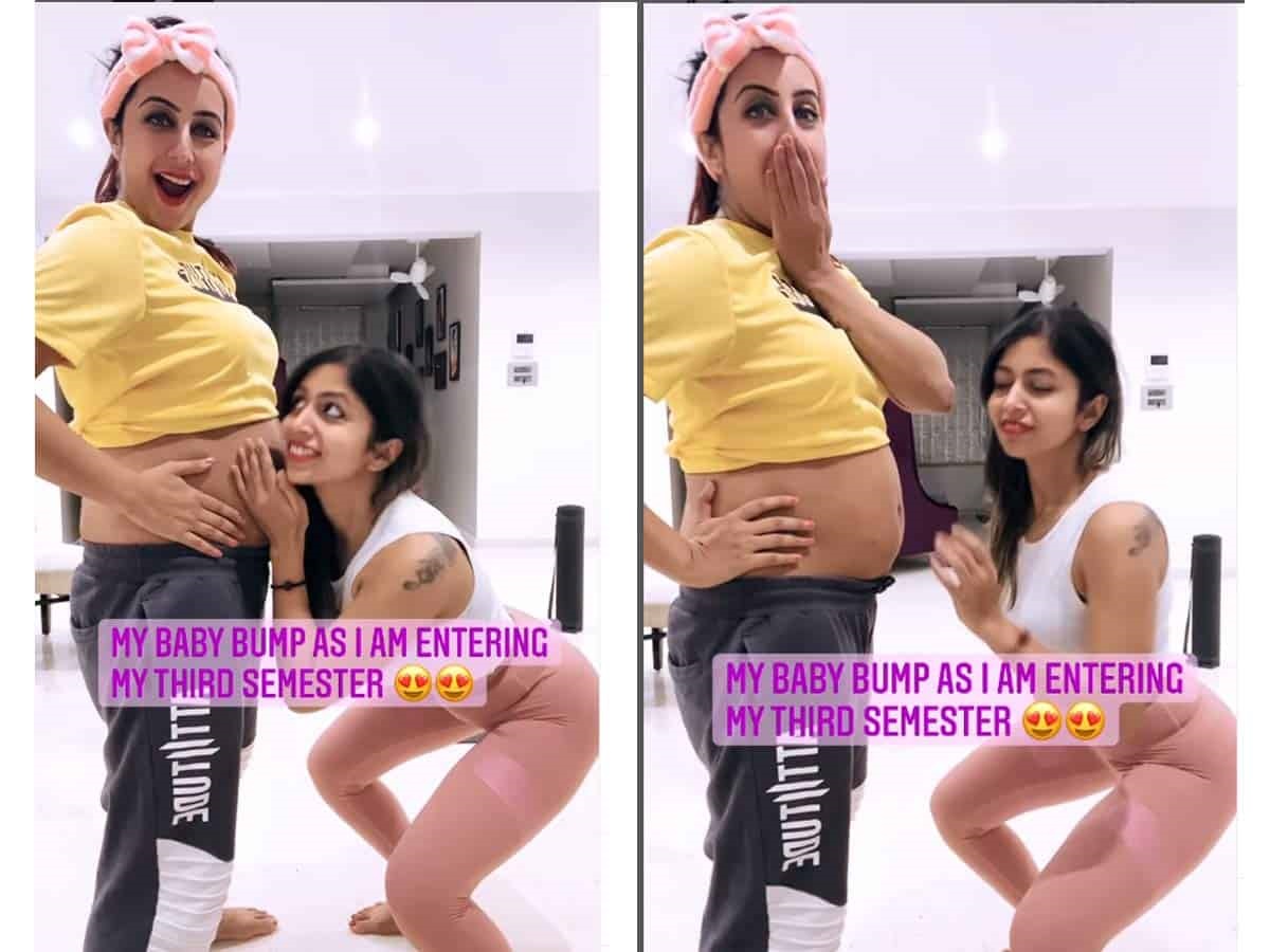 Sanjjanaa Galrani, an entertainer, is pregnant and flaunts her baby belly in a new instagram video. The starlet is in her third trimester, and she appears to be loving every minute of it. "With my prenatal yoga teacher #tannybhattacharjee," sanjjanaa posted a video of herself displaying her baby bump with her yoga instructor.