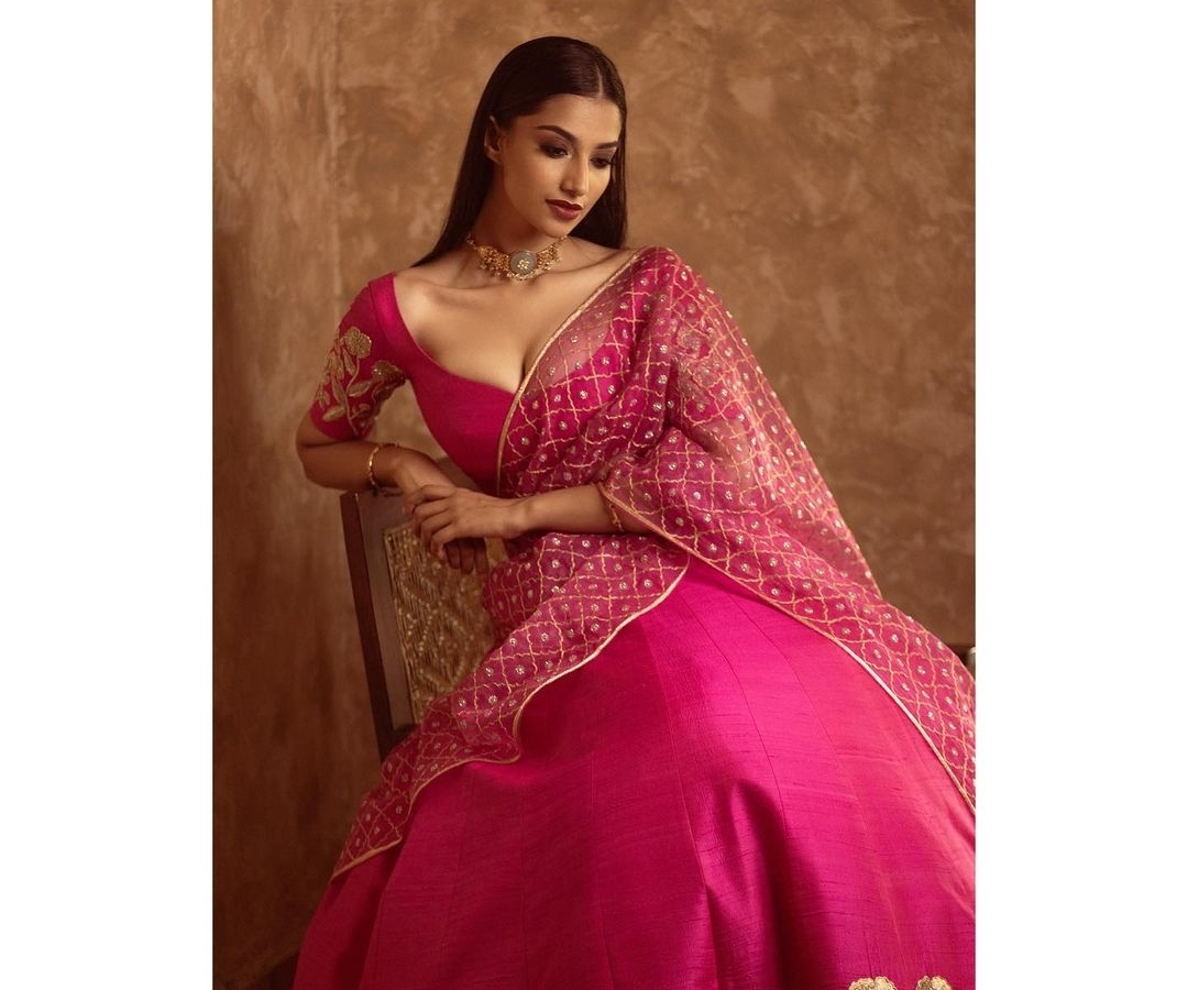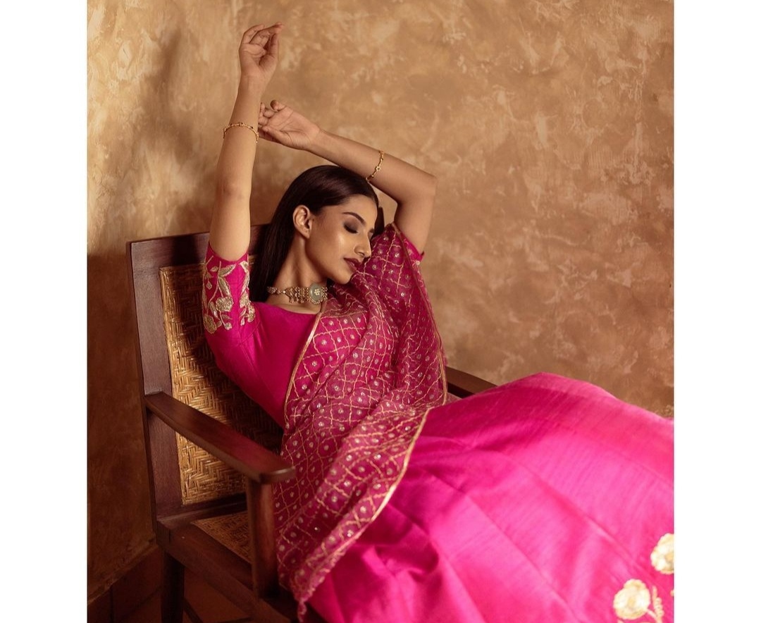 మీనాక్షి చౌదరి ఇచ్చట వాహనములు నిలుపరాదు సినిమాతో టాలీవుడ్ ఇండస్ట్రీ లోకి ఎంట్రీ ఇచ్చింది, ఈ మూవీ ఈ ముద్దుగుమ్మకు బాక్స్ ఆఫీస్ దగ్గర  సక్సెస్ ను తీసుకురాలేకపోయింది, కాకపోతే ఈ ముద్దుగుమ్మకు ఈ సినిమా తర్వాత మాస్ మహారాజా హీరోగా తెరకెక్కిన ఖిలాడి సినిమాలో అవకాశం దక్కింది, ఈ సినిమా  కొన్ని రోజుల క్రితమే విడుదల అయింది, ప్రస్తుతం కూడా ఈ సినిమా థియేటర్ లలో ప్రదర్శించబడుతుంది. ఇలా సినిమాలతో ప్రేక్షకులను అలరిస్తున్న మీనాక్షి చౌదరి సోషల్ మీడియా ద్వారా కూడా అలరిస్తూనే ఉంది, ఈ ముద్దుగుమ్మ సోషల్ మీడియా వేదికగా తన అందాలను ఆరబోయడంలో ఏమాత్రం వెనుకడుగు వేయడం లేదు, ఎప్పటికప్పుడు తన అందాల ప్రదర్శితమయ్యేల  ఉండే ఫోటోలను సోషల్ మీడియాలో పోస్ట్ చేసే ఈ హాట్ బ్యూటీ తాజాగా కూడా కొన్ని పిక్స్ ని పోస్ట్ చేసింది.  ఈ పిక్స్ లో మీనాక్షి చౌదరి రెడ్ కలర్ సారి కట్టుకొని,  అందుకు తగిన బ్లౌజ్ ను ధరించి , తన ఎద అందాలు ఫోకస్ అయ్యేలా డిఫరెంట్ డిఫరెంట్ యాంగిల్స్ లో పిక్స్ స్టిల్స్ ఇచ్చింది,  సారీ లుక్ లో ఉన్న మీనాక్షి చౌదరి కి సంబంధించిన ఈ పిక్స్ ని చూసిన కొంత మంది నెటిజన్లు గార్జియస్, ప్రిన్సెస్ , లవ్ సింబల్ ఎమోజీ లను కామెంట్లుగా పెడుతున్నారు.
