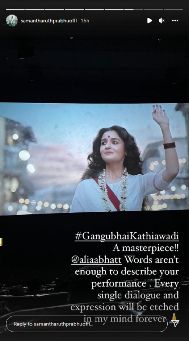 ఇక గంగూ భాయ్ సినిమా పై సమంత ఏకంగా ప్రశంసల వర్షం కురిపిస్తోంది.. ఈ సినిమాలో ఆలియా భట్ యొక్క అందం చాలా ప్రత్యేకమైనదిగా చెప్పుకొచ్చింది సమంత. ఆమె నటన గురించి కూడా ప్రభావితం చేసే టువంటి ఒక పోస్ట్ ను కూడా షేర్ చేసింది తన ఇంస్టాగ్రామ్ లో. ఇక ఫోటోలు, ఆలియాభట్ ఫోటోలు షేర్ చేస్తూ గంగూ భాయ్ ఒక మాస్టర్ పిక్ సినిమా అంటూ తెలియజేసింది.. ఈ సినిమాలో ప్రతి ఒక్క డైలాగ్, ఆమె ఎక్స్ప్రెషన్స్ మైండ్ బ్లోయింగ్ గా ఉన్నాయని తెలియజేసింది. ఇక ఆలియాభట్ ఎంతో అద్భుతమైన నటనని చూపించింది అంటూ తన పై అభిమానం చాటుకుంది సమంత.