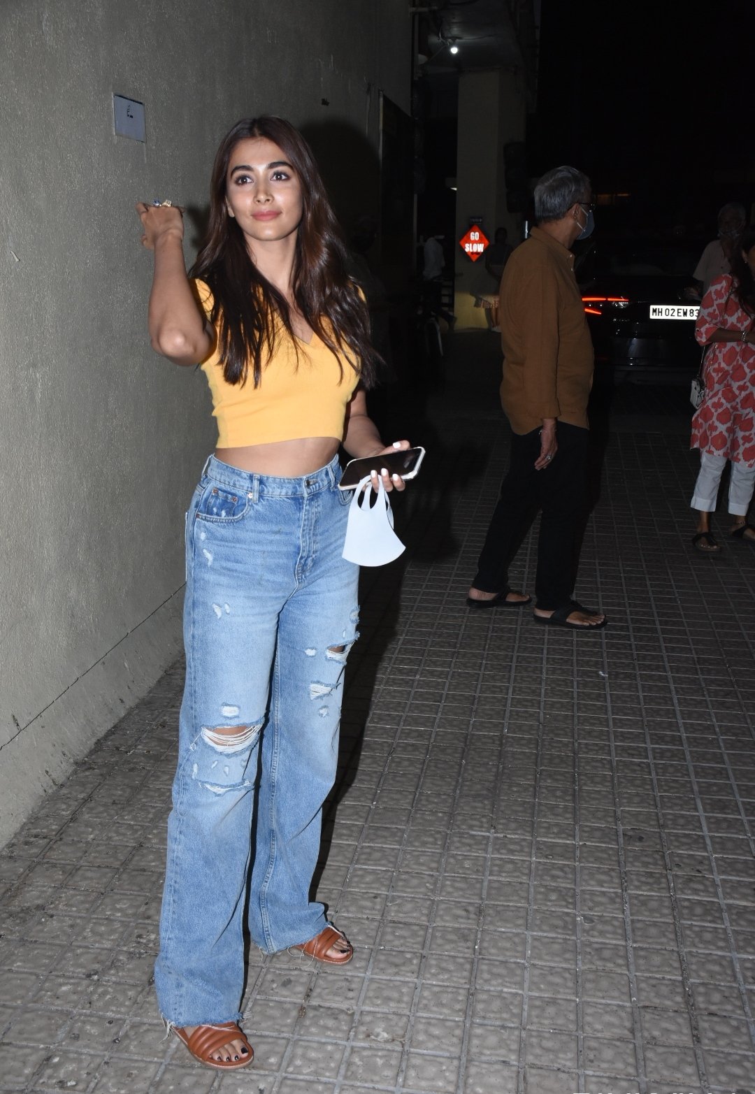 Pooja Hegde wore tattered jeans and a yellow tube top and looked like a beam of sunshine. Her breezy white top was ideal for the warm weather because it was simple, comfortable, and fashionable. She finished the ensemble with brown heels and no other embellishments. pink lips, manicured brows, kohl-rimmed eyes, and hints of gentle blush were the actress's make-up choices. She posed for the photographers like a diva, her hair open and center-parted.
