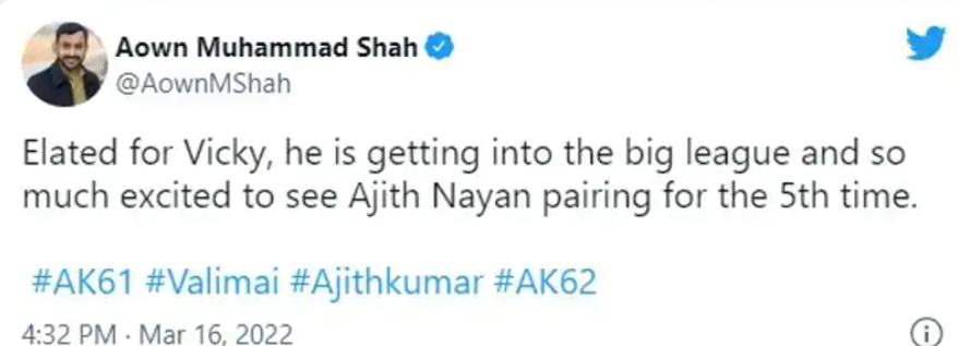 Following this, director Vignesh Shivan ajith has decided to direct Ajith's 62nd film.  Lady Superstar Nayanthara who is also Vignesh Shivan's lover is paired opposite ajith Kumar. An update on the new creation is expected to be released on Ajith's birthday on May 1. Meanwhile, a popular Pakistani journalist has congratulated Vignesh Sivan on his twitter page about the film. This came as a shock for all ajith fans. Ajith's fame is spread to nearby countries also.