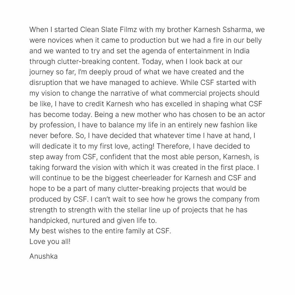 "Today, when I reflect on our journey thus far, I'm incredibly pleased of what we've accomplished and the disruption we've caused," she continued. anushka further noted that as a young mum who has chosen to pursue a career as an actor, she has to balance her life in such a way she has never done before. "As a result, I've chosen to devote whatever free time I have to my first love, acting!" As a result, I've decided to leave CSF, knowing that the most capable person, Kaarnesh, is carrying on the goal that inspired it in the first instance," she said.
