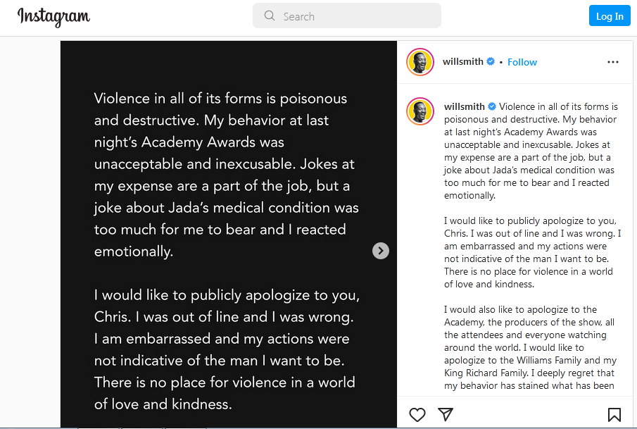 Will Smith, the actor, has expressed regret for the incident. On his instagram feed, he wrote, "Violence is like poison." My behaviour at last night's Academy Awards was both unprofessional and unacceptable.