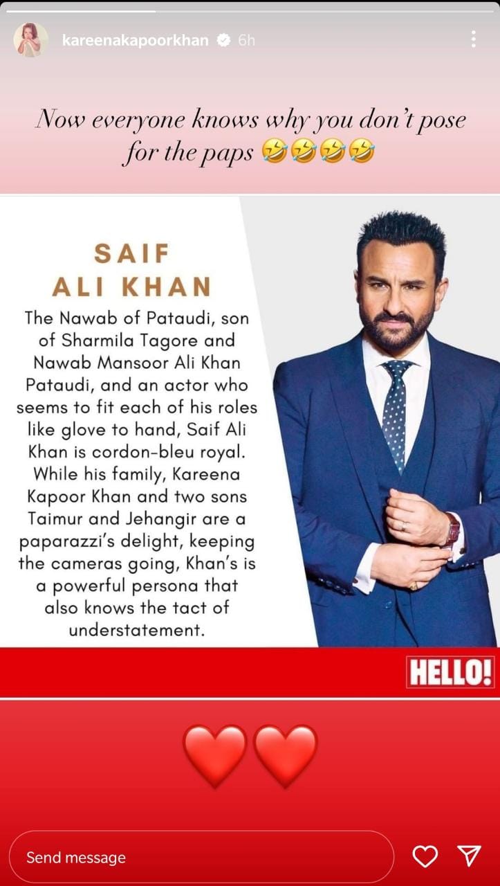 Kareena had shared a profile photo of Saif in hello Magazine a few days back. She had written, "Nawab of Pataudi dynasty, son of sharmila tagore and Nawab Mansoor ali Khan Pataudi, an actor who can play any role.