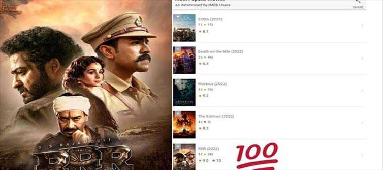 అయితే ఈ లిస్ట్ లో ఇటీవల ఆస్కార్ అవార్డు సాధించిన 'కోడా' చిత్రం మొదటి స్థానంలో ఉండగా.. డెత్ ఆన్ ది నైల్, మార్బియస్, బ్యాట్ మేన్ తర్వాత స్థానాల్లో 'ఆర్.ఆర్.ఆర్' నిలిచింది. ఇకపోతే ఈ లిస్ట్ లో 'ఆర్.ఆర్.ఆర్' మినహా మరో భారతీయ చిత్రానికి స్థానం లేకపోవడం గమనార్హం.కాగా  రాజమౌళి దర్శకత్వ ప్రతిభ, తారక్, చెర్రీల అభినయ విన్యాసం, అబ్బుర పరిచే గ్రాఫిక్స్ మాయాజాలం ఈ సినిమాను ప్రపంచ చిత్రాల సరసన నిలబెట్టాయని వేరే చెప్పాల్సిన పనిలేదు...!!