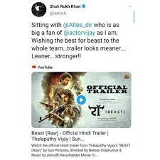 Bollywood Badshah shahrukh khan made interesting comments on Dalapati Vijay, Beast movie. Upcoming movie Beast from Vijay. Shah Rukh Khan showered praises on Vijay after watching the hindi trailer of the movie. Shah Rukh tweeted and said great things about Vijay. He told Vijay that he is a big fan. Shah Rukh Khan made some more interesting comments on this occasion.