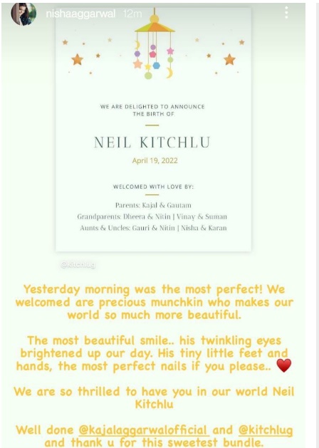 అలా స్టార్ హీరోయిన్ ల సరసన కాజల్ అగర్వాల్ చేరడం మాత్రమే కాకుండా ఎంతో కాలం పాటు టాలీవుడ్ ఇండస్ట్రీలో స్టార్ హీరోయిన్ లలో ఒకరిగా కొనసాగింది.  ఇది ఇలా ఉంటే  కాజల్ అగర్వాల్ ప్రస్తుతం ఆచార్య సినిమాలో హీరోయిన్ గా నటించింది.  ఇది ఇలా ఉంటే కాజల్ అగర్వాల్ 2020 వ సంవత్సరం అక్టోబర్ నెలలో తన స్నేహితుడు గౌతమ్ కిచ్లూ ని వివాహం చేసుకున్న విషయం మనందరికీ తెలిసిందే.  తాజాగా  కాజల్ అగర్వాల్ పండంటి మగబిడ్డకు జన్మనిచ్చిన విషయం మనందరికీ తెలిసిందే. ఈ  విషయాన్ని కాజల్ అగర్వాల్ సోదరి నిషా అగర్వాల్ సోషల్ మీడియా ద్వారా వెల్లడించింది. ఇది ఇలా ఉంటే  కాజల్ అగర్వాల్ కొడుకు ఎలా ఉన్నాడో, ఏం పేరు పెట్టబోతున్నారో అనే ఆసక్తి కాజల్ అగర్వాల్ అభిమానుల్లో నెలకొంది. ఈ విషయానికి సంబంధించి నిషా అగర్వాల్ ఫుల్ క్లారిటీ ఇచ్చింది. కాజల్ అగర్వాల్  కుమారుడికి 'నీల్ కిచ్లూ' అనే పేరు పెడుతున్నట్టు ఇన్ స్టాగ్రామ్ ద్వారా ఆమె వెల్లడించింది.