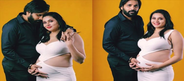 ప్రస్తుతం నమిత గర్భవతి అనే సంగతి తెలిసిందే. ఇటీవలే నమిత తాను త్వరలో తల్లిని కాబోతున్న విషయాన్ని సోషల్ మీడియాలో పోస్ట్ చేసింది. బేబీ బంప్ ఫొటోలతో ఫ్యాన్స్ అందరికి స్వీట్ షాక్ ఇచ్చింది. తాజాగా నమిత మరోసారి తన ఫోటోస్ పోస్ట్ చేసింది. ఈ సారి తన భర్తతో రొమాంటిక్ గా, బోల్డ్ గా ఉన్న పిక్స్ పోస్ట్ చేసింది. వైట్ హాట్ డ్రెస్ లో నమిత బేబీ బంప్ చూపిస్తూ భర్తతో ముద్దుల్లో మునిగితేలుతోంది నమిత .