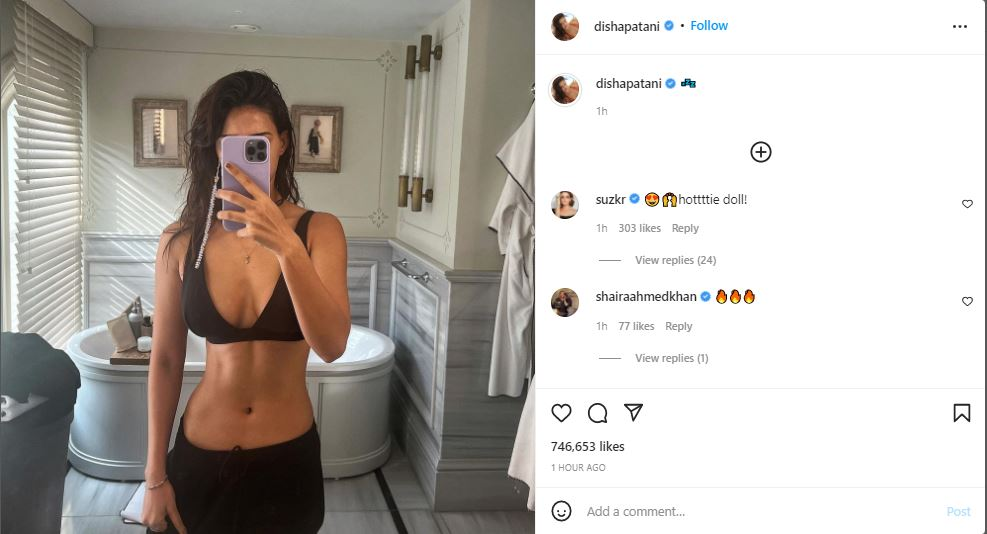 తెలుగు పరిశ్రమలోకి లోఫర్ సినిమా ద్వారా అడుగుపెట్టిన హీరోయిన్ దిశా పటాని ప్రస్తుతం బాలీవుడ్లో బిజీ హీరోయిన్గా మారిపోయింది. అక్కడ వరుస సినిమాలు చేస్తూ తన కెరీర్ ని బాగా దూసుకుపోతోంది. స్టార్ హీరోలకు మోస్ట్ వాంటెడ్ హీరోయిన్ గా మారిపోయింది ఈ ముద్దుగుమ్మ. ఇక సోషల్ మీడియాలో కూడా ఎక్కువగా అందాల ఆరబోత కు సంబంధించి ఫోటో షూట్లను షేర్ చేస్తూ కుర్రకారు ల ఇబ్బంది పెడుతూ ఉంటుంది. ఇక దీంతో ఈ అమ్మడి ఫోటోలకు కొన్ని లక్షల లైకులు వస్తూనే ఉన్నాయి.ఇప్పటివరకు ఎన్నో లొకేషన్ లో ఫోటోలు తీసి  సోషల్ మీడియాలో పోస్ట్ చేసిన దిశాపటాని ఇప్పుడు తాజాగా బాత్రూంలో ఫోటో తీసుకొని షేర్ చేసింది. కొన్ని రోజుల క్రితం దిశా ఈ ఫోటోని షేర్ చేయగా ఇప్పుడు వైరల్ గా మారుతోంది. ఇప్పటివరకు ఈ మెసేజ్ షేర్ చేసిన ఫోటోలు ఒక ఎత్తయితే ఈ ఫోటో మాత్రం ఒక ఎత్తు అన్నట్లుగా ఈమె అభిమానులు సోషల్ మీడియాలో తెలియజేస్తున్నారు. క్లీవేజ్  షో తో పాటు థైస్ ఎక్స్పోజింగ్, నడుము అందాలను చూపిస్తూ ప్రేక్షకులను బాగా ఆకట్టుకుంటోంది.అందుచేతనే అందమైన తన ఫిజిక్ ను మరింత చూపించడంలో ఎప్పుడూ సక్సెస్ అవుతూనే ఉంటుంది దిశాపటాని. ఇక ఈ ఫోటో విషయానికి వస్తే తన ఫోటోను ఫేస్ కూడా చూపించకుండా ఈ అమ్మడు కేవలం తన అందాలను మాత్రమే చూపిస్తూ ఉన్నది. దిశా పటాని ఇలాంటి ఫోటో నే సెల్ఫీ ద్వారా షేర్ చేయడంతో అభిమానులు తెగ లైక్స్ కొడుతున్నారు. ఇక బాలీవుడ్ లో హాట్ బ్యూటీస్ కి పోటీపడుతూ నటిస్తోంది. ఇక ఈ ముద్దుగుమ్మ సినిమాల విషయానికి వస్తే గత సంవత్సరం సల్మాన్ ఖాన్ తో కలిసి ఒక చిత్రంతో ప్రేక్షకుల ముందుకు వచ్చింది. ఈ ఏడాది కూడా ఆమె నటించిన చిత్రాలు విడుదల కాబోతున్నాయి.