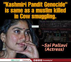 Condemning violence in the name of religion, actress sai pallavi on wednesday likened the exodus of Kashmiri Pandits to cow vigilantism. The actress said, "Kashmir Files showed how Kashmiri Pandits were killed at that time. If you are taking the issue as a religious conflict, there was a recent instance where a Muslim was attacked. When he was driving a vehicle carrying cows, and people. . chanted jai Shri Ram. So what is the difference between what happened then and what is happening now? "