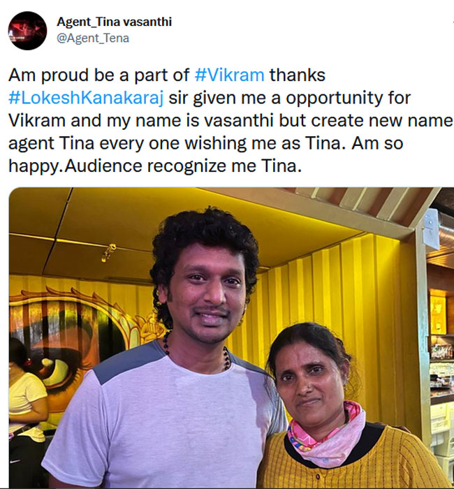 ఇక ఇదంతా ఇలా ఉండగా ఇందులో కీలకమైన పాత్రలో నటించిన టినా అనే మహిళ విలన్లకు చుక్కలు చూపించింది. కేవలం వన్ పిక్చర్ తోనే విలన్లను ఎదుర్కొని ప్రేక్షకులను బాగా అలరించింది. ఇక కమల్ కొడుకు ఇంట్లో పనిమనిషిగా ఉన్న టీనా ఉన్నట్టుండి రిపోర్టింగ్ సర్ అంటూ విలన్లకు చెమటలు పట్టించింది. అయితే ఇంతకు ఎవరు ఈ టినా అనే విషయానికి వస్తే. ఈమె అసలు పేరు వాసంతి ఇమే ఒక కొరియోగ్రాఫర్. కోలీవుడ్లో టాప్ స్టార్స్ నటించిన పలు చిత్రాలకు ఈయన కొరియోగ్రాఫర్గా వరకు చేసింది. అయితే ఈమె విక్రమ్ సినిమాతో తొలిసారిగా వెండితెరపై కనిపించింది. విక్రమ్ లో కూడా విభిన్నమైన పాత్రను పోషించి ప్రేక్షకులను బాగా ఆకట్టుకుంది.