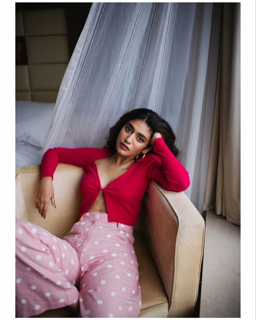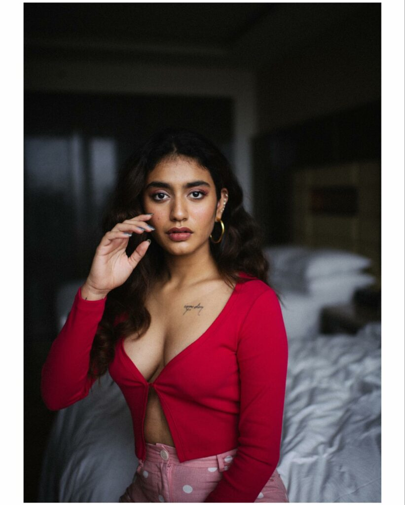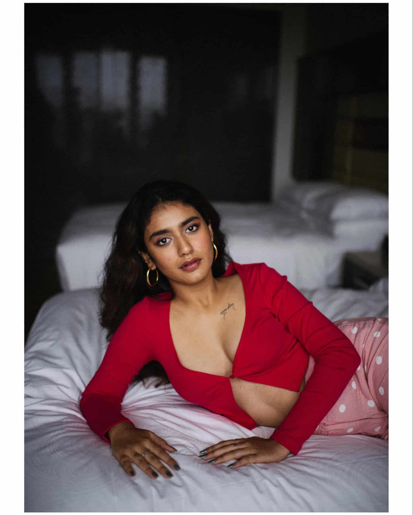 Priya Prakash Varrier, who earlier ignited the internet with her wink, has achieved this feat once more with her seductive images. Recently, the actress posted a few images of herself wearing a red top with a plunging neckline and pink polka-dot pants to her instagram account. priya sat on a bed and looked into the camera. She was incredibly stunning. The two images that have increased the level of mercury on social media have garnered unrelenting praise from online users.