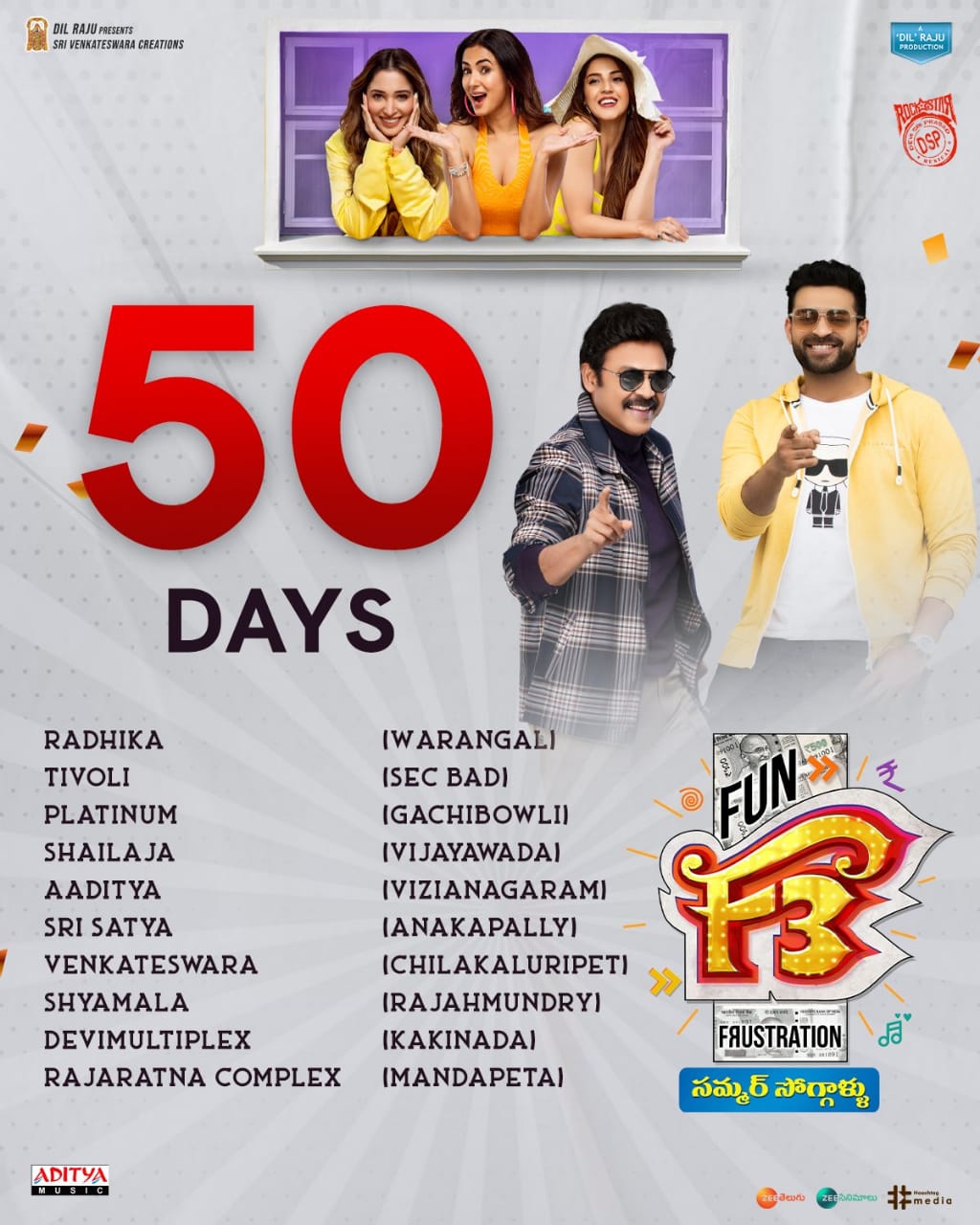 బాక్సా ఫీస్ దగ్గర మంచి కలెక్షన్ లను సాధించిన ఈ సినిమా ఈ రోజుతో విజయవంతంగా 50 రోజులు పూర్తి చేసుకుంది. దానితో ఎఫ్ 3 చిత్ర బృందం ఈ సినిమా 50 రోజులు పూర్తి చేసుకున్న సందర్భంగా ఒక ప్రత్యేక పోస్టర్ ను కూడా విడుదల చేసింది. అలాగే ఈ ప్రత్యేక పోస్టర్ లో ఈ సినిమాథియేటర్ లలో 50 రోజులు పూర్తి చేసుకుంది అనే వివరాలను కూడా అధికారికంగా ప్రకటించింది . 10 సెంటర్ లలో ఎఫ్ 3 మూవీ 50 రోజులు పూర్తి చేసుకుంది.