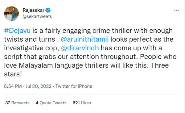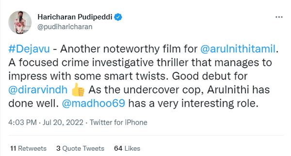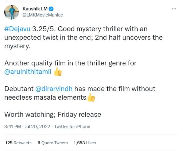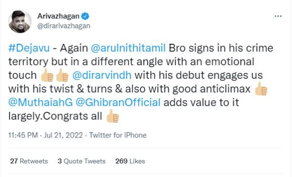 In that way, many people who have seen the film are expressing their criticisms on Twitter. Fans have said that Arul Nidhi's performance is good as usual and his acting without many demonstrations suits the film.