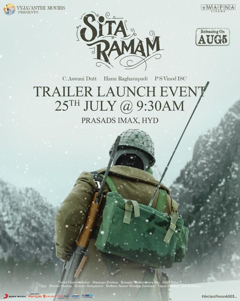 మూవీ ని ఆగస్ట్ 5 వ తేదీన విడుదల చేయనున్నట్లు చిత్ర బృందం ఇప్పటికే అధికారికంగా ప్రకటించింది.  ఇలా ఈ సినిమా విడుదల తేది దగ్గర పడటంతో కొంత కాలం క్రితమే ఈ సినిమా ట్రైలర్ ను జూలై 25 వ తేదీన విడుదల చేయనున్నట్లు మూవీ యూనిట్ ప్రకటించింది. ఇది ఇలా ఉంటే తాజాగా ఈ మూవీ యూనిట్ ఈ సినిమా ట్రైలర్ ను జూలై 25 వ తేదీన ఉదయం 9 గంటల 30 నిమిషాలకు ప్రసాద్ ఐమాక్స్ హైదరాబాద్ లో విడుదల చేయనున్నట్లు అధికారికంగా ప్రకటిస్తూ  ఒక పోస్టర్ ను కూడా విడుదల చేసింది.  మరి ఈ మూవీ ట్రైలర్ ప్రేక్షకులను ఏ మేరకు ఆకట్టుకుంటుందో చూడాలి.