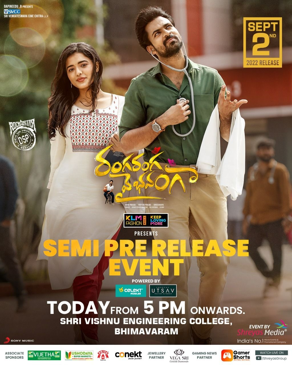 మూవీ సెప్టెంబర్ 2 వ తేదీన విడుదల కాబోతోంది. ఈ మూవీ లో వైష్ణవ్ తేజ్ సరసన కేతికా శర్మ హీరోయిన్ గా నటించగా గిరిశయ్య ఈ మూవీ కి దర్శకత్వం వహించాడు. ఇది ఇలా ఉంటే తాజాగా ఈ మూవీ నుండి ఒక అప్డేట్ ను ఈ మూవీ యూనిట్ విడుదల చేసింది. ఈ మూవీ సెమీ ఫ్రీ రిలీజ్ ఈవెంట్ వేడుకను ఈరోజు సాయంత్రం 5 గంటలకు శ్రీ విష్ణు ఇంజనీరింగ్ కాలేజ్, భీమవరం లో నిర్వహించనున్నట్టు చిత్ర బృందం అధికారికంగా ప్రకటించింది. ఈ మూవీ కి దేవి శ్రీ ప్రసాద్ సంగీతాన్ని అందించాడు.